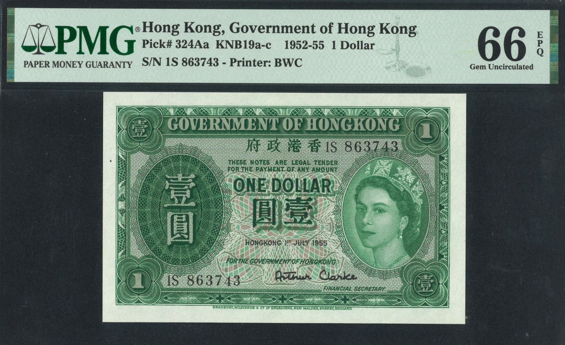 1955, 香港政府, 壹圓, 編號:1S 863743. PMG 66EPQ. 膽年