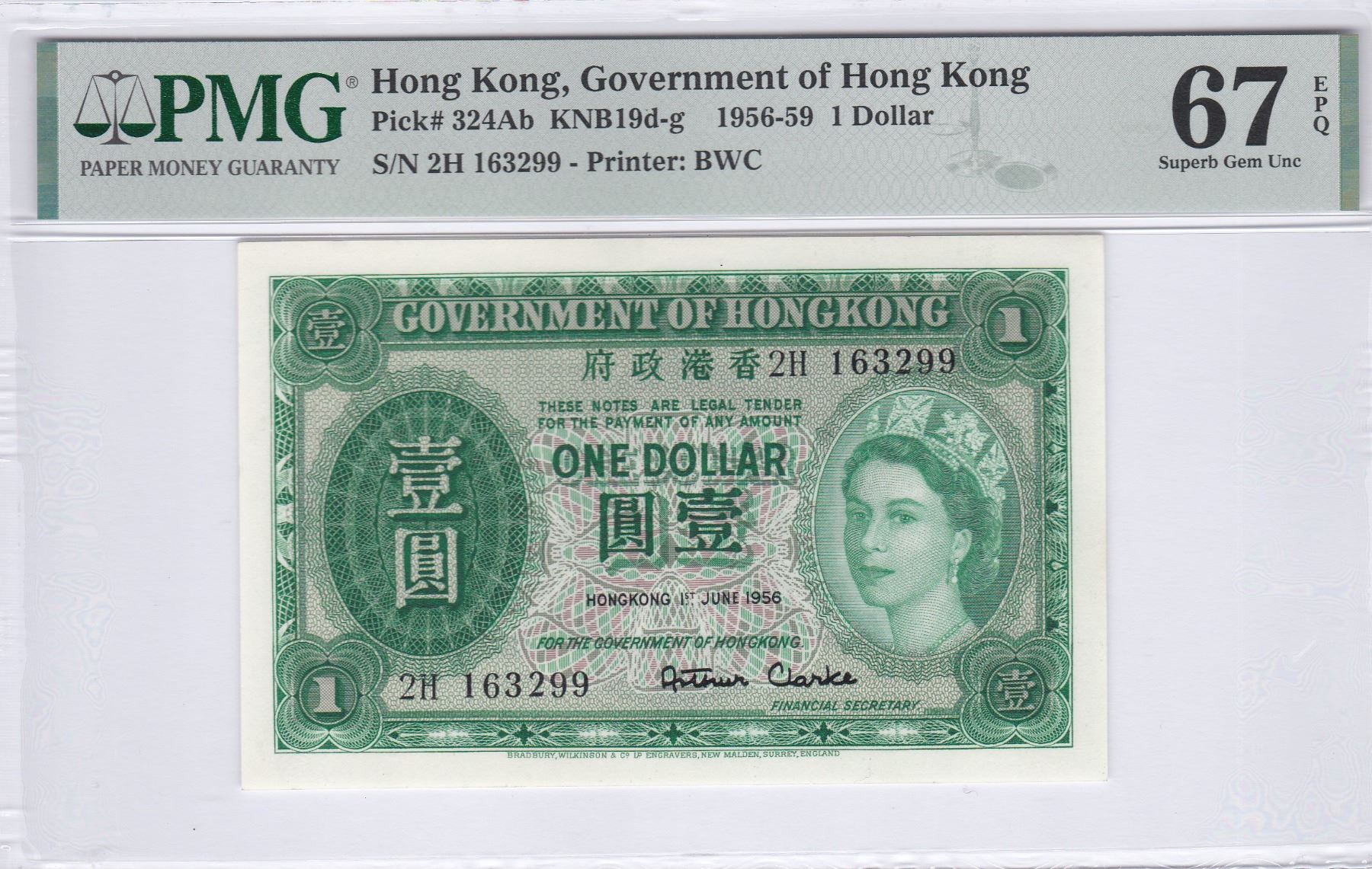 1956, 香港政府, $1, 編號: 2H 163299 . PMG 67EPQ.