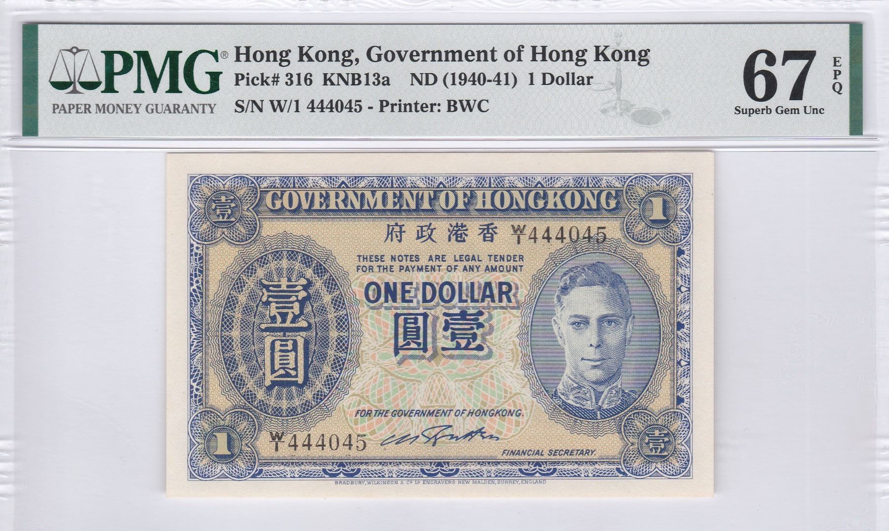 Hong Kong Government, ND (1940-41), $1, W/1 444045. PMG 67EPQ.