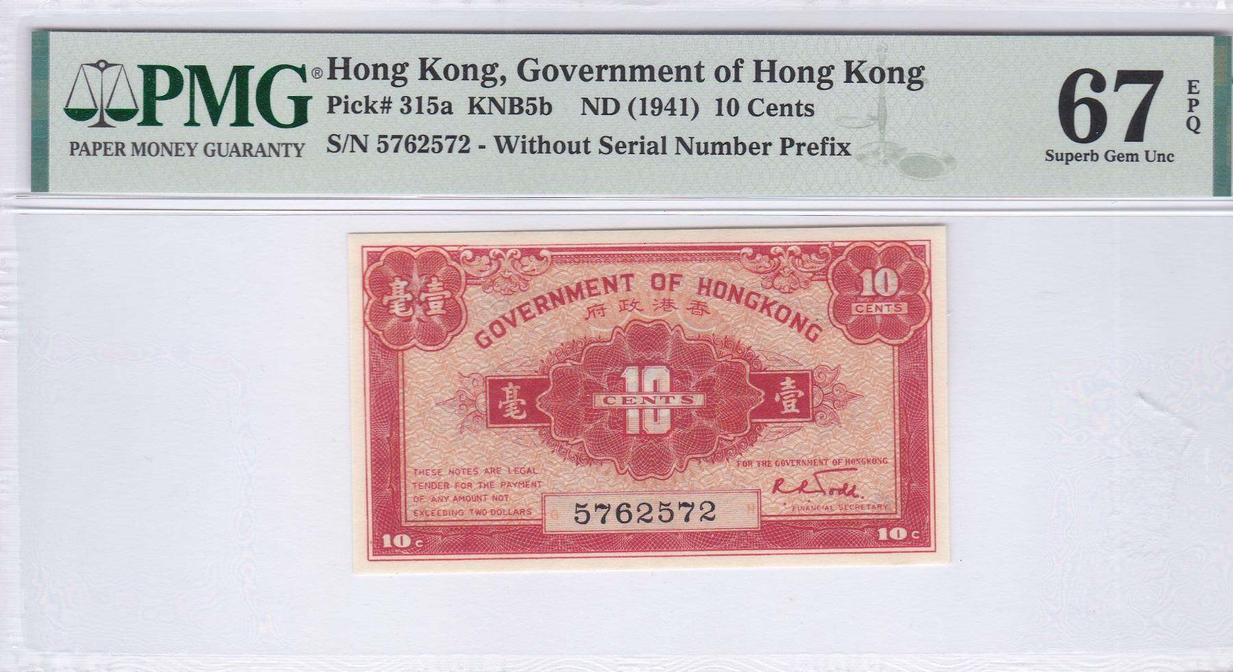 Hong Kong Government, ND (1941) 10cents A5762572. PMG 67EPQ