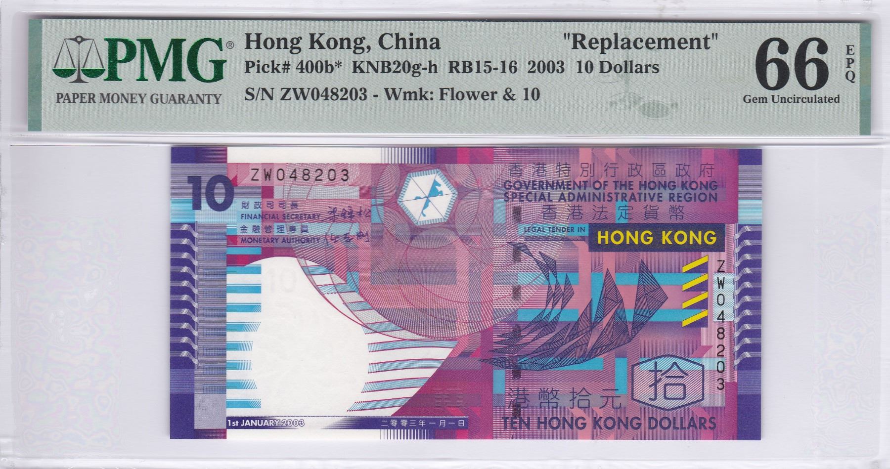 Hong Kong Government SAR, 2003, $10, ZW048203, PMG 66EPQ. Replacement. Rare ZW Prefix in 2003.