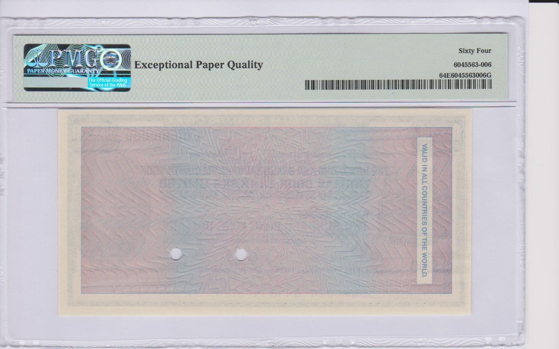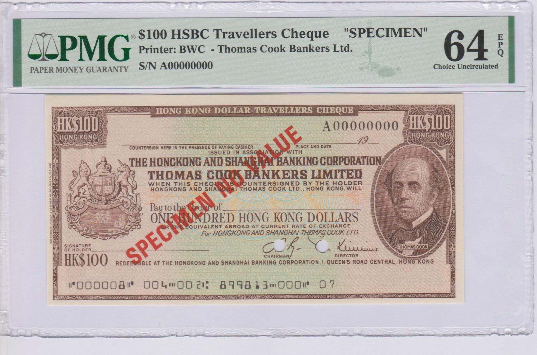 A00000000, 樣票 PMG 64EPQ $100 香港匯豐銀行旅行支票, A00000000, Specimen PMG 64EPQ $100 Hong Kong HSBC Travellers Cheque
