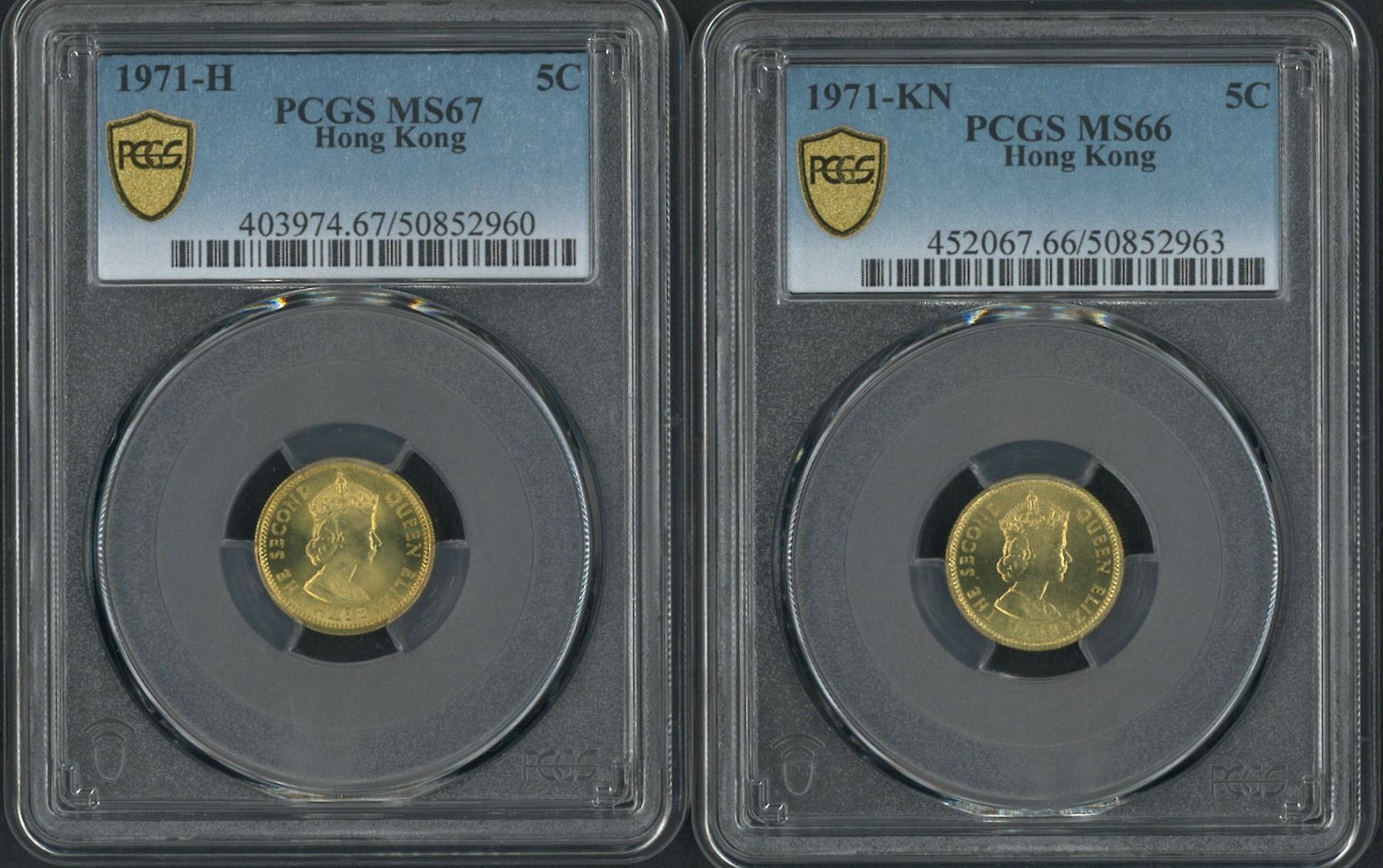 1971KN & 71H, 香港伊莉莎白二世五仙不同廠銘兩枚, PCGS MS66 及MS67.