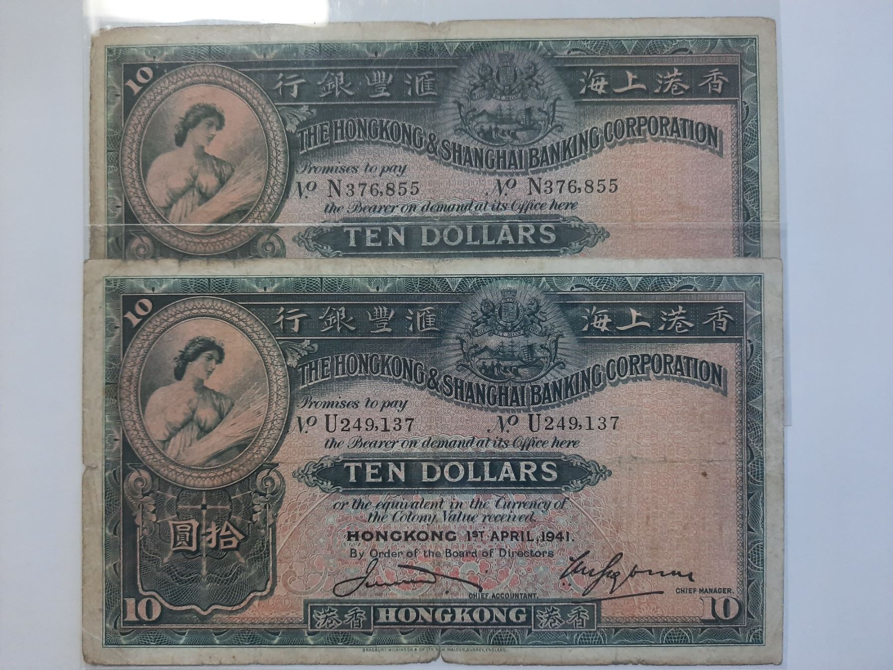 N376855 及 U249137, 1941 香港匯豐銀行, 10 圓, VF 品 x2, N376855 and U249137, 1941 Hong Kong Shanghai Banking Corp, 10 dollars, VF Condition x2