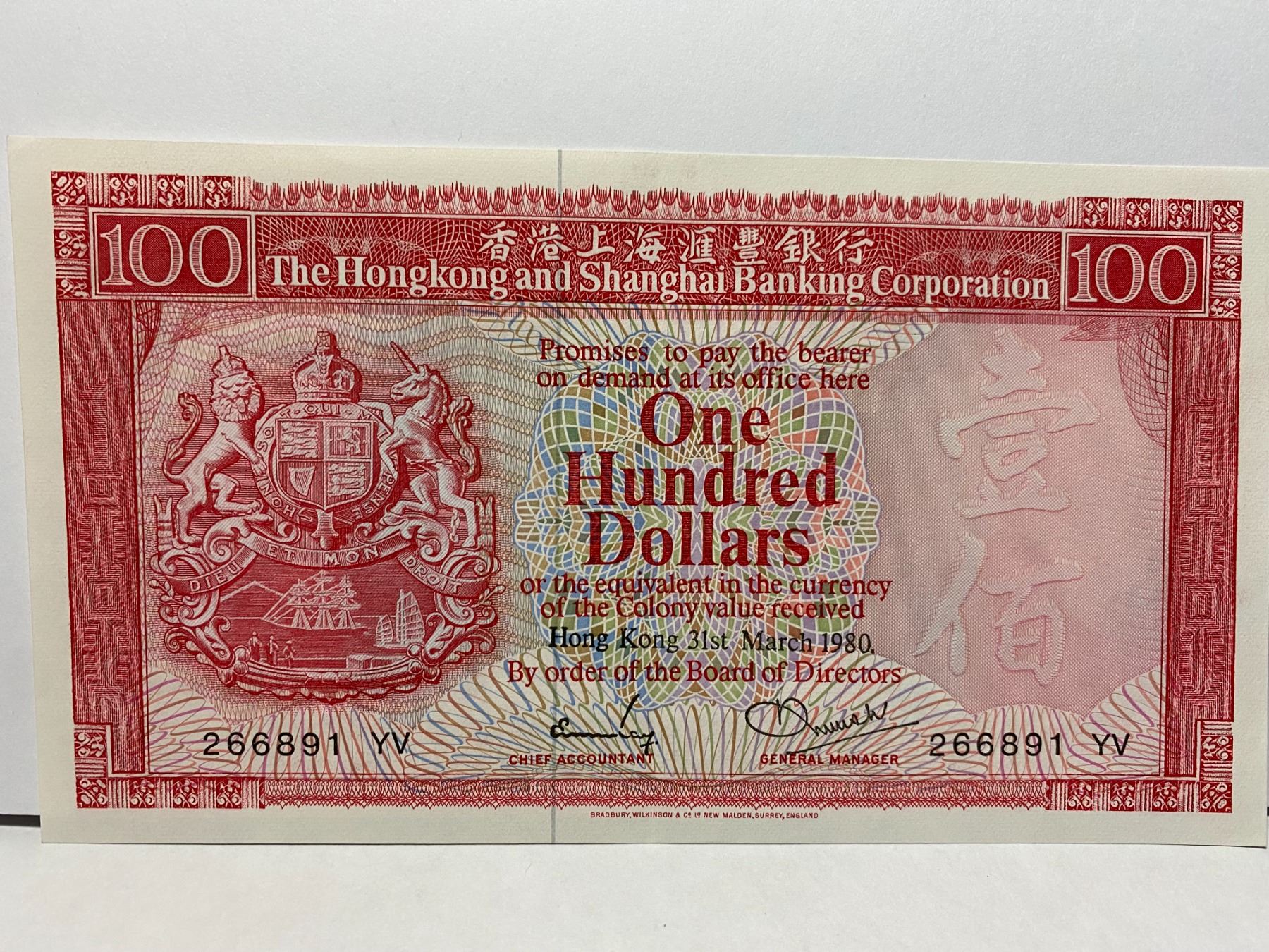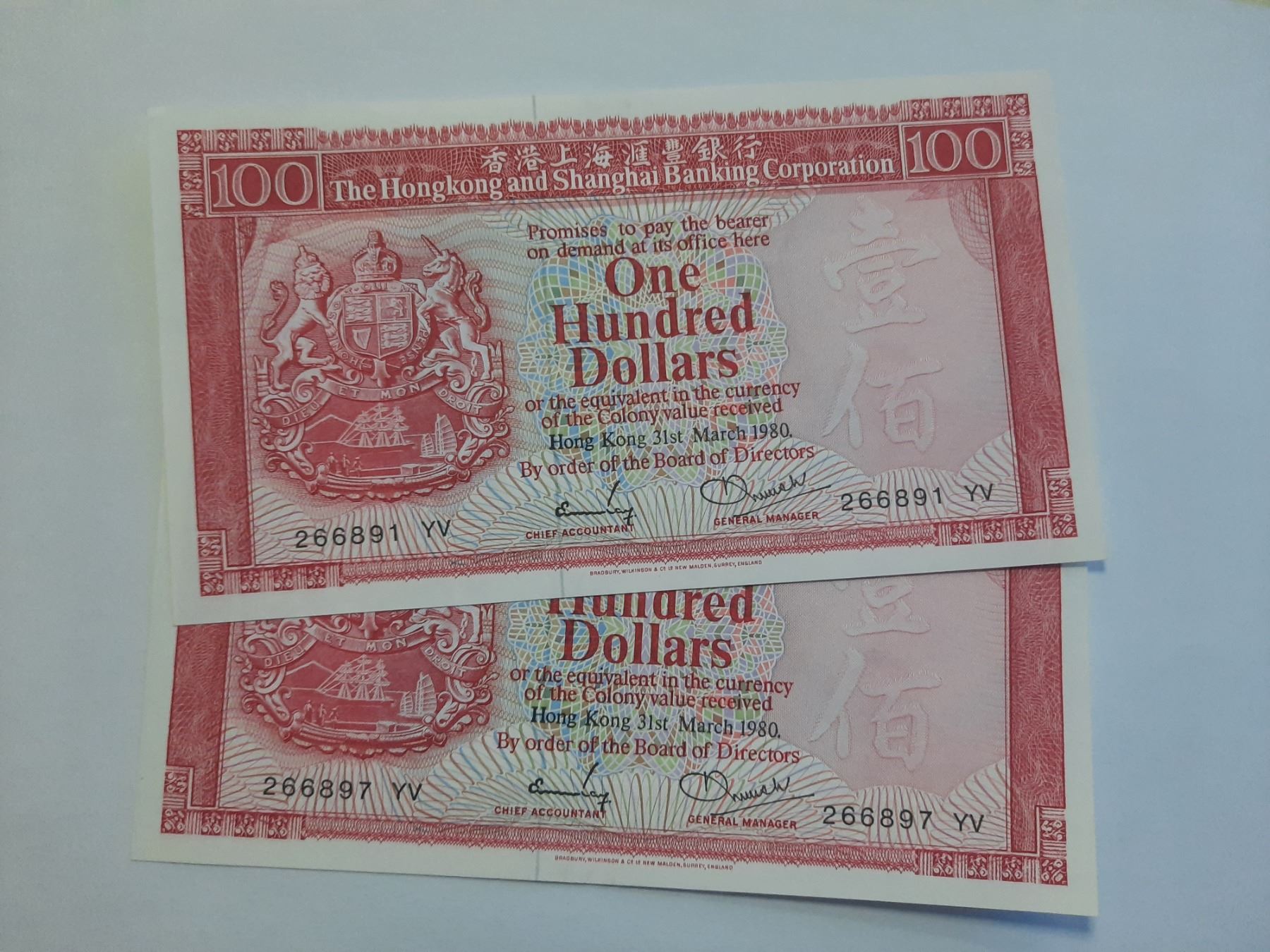 266891YV 及 266897YV, 1980 香港匯豐銀行, 100 圓, AU 品x2, 266891YV and 266897YV, 1980 Hong Kong Shanghai Banking Corp, 100 dollars, AU Conditionx2