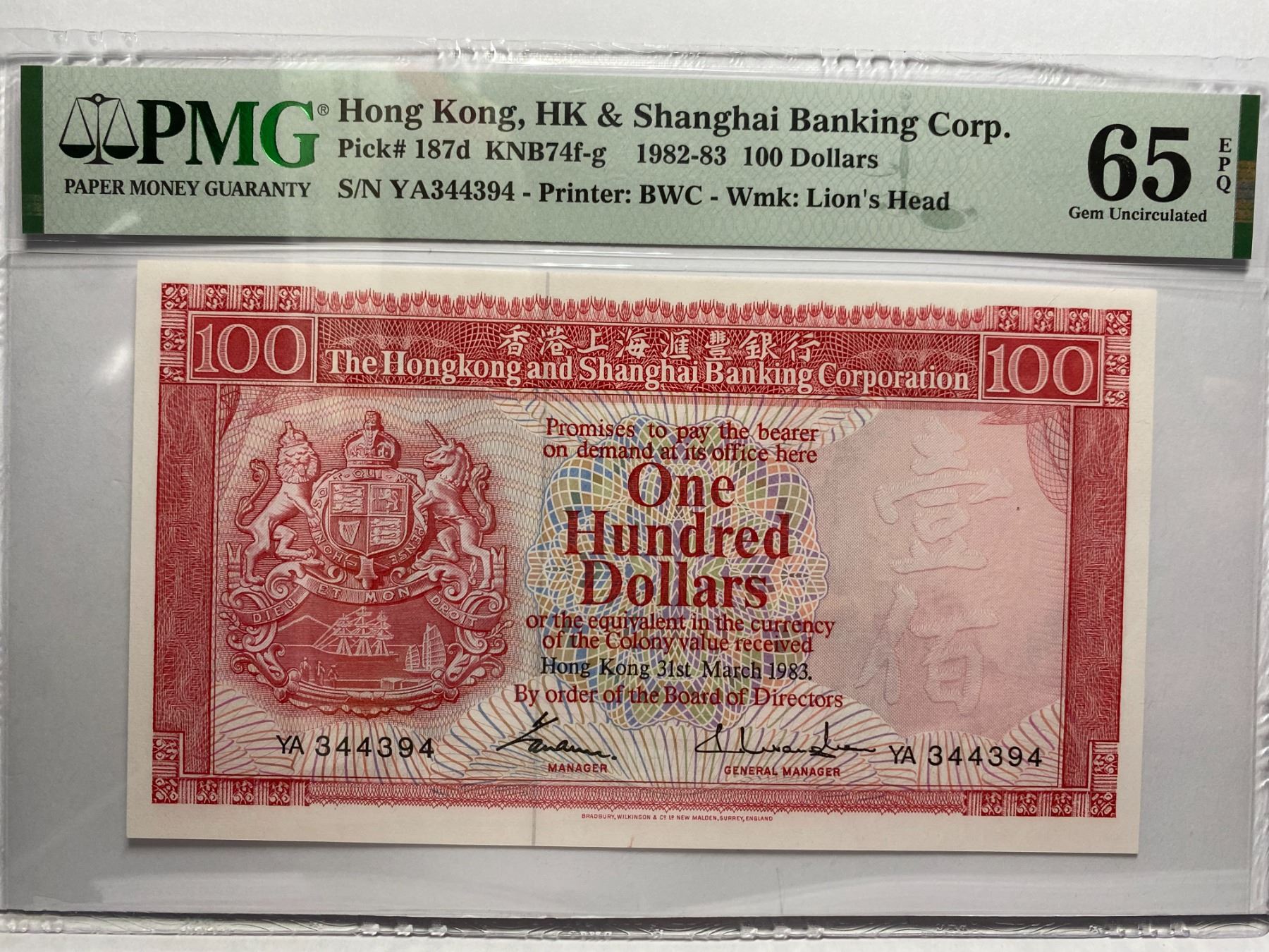 YA344394, 1983 香港匯豐銀行, 100 圓, PMG 65EPQ, YA344394, 1983 Hong Kong Shanghai Banking Corp, 100 dollars, PMG 65EPQ