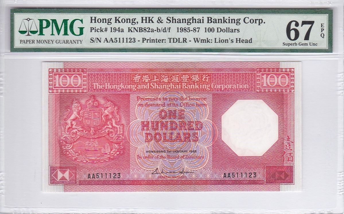 Hong Kong, Shanghai Banking Corp, 100 dollars, 1985, S/N. AA511123 First Prefix, P-194a, PMG 67EPQ