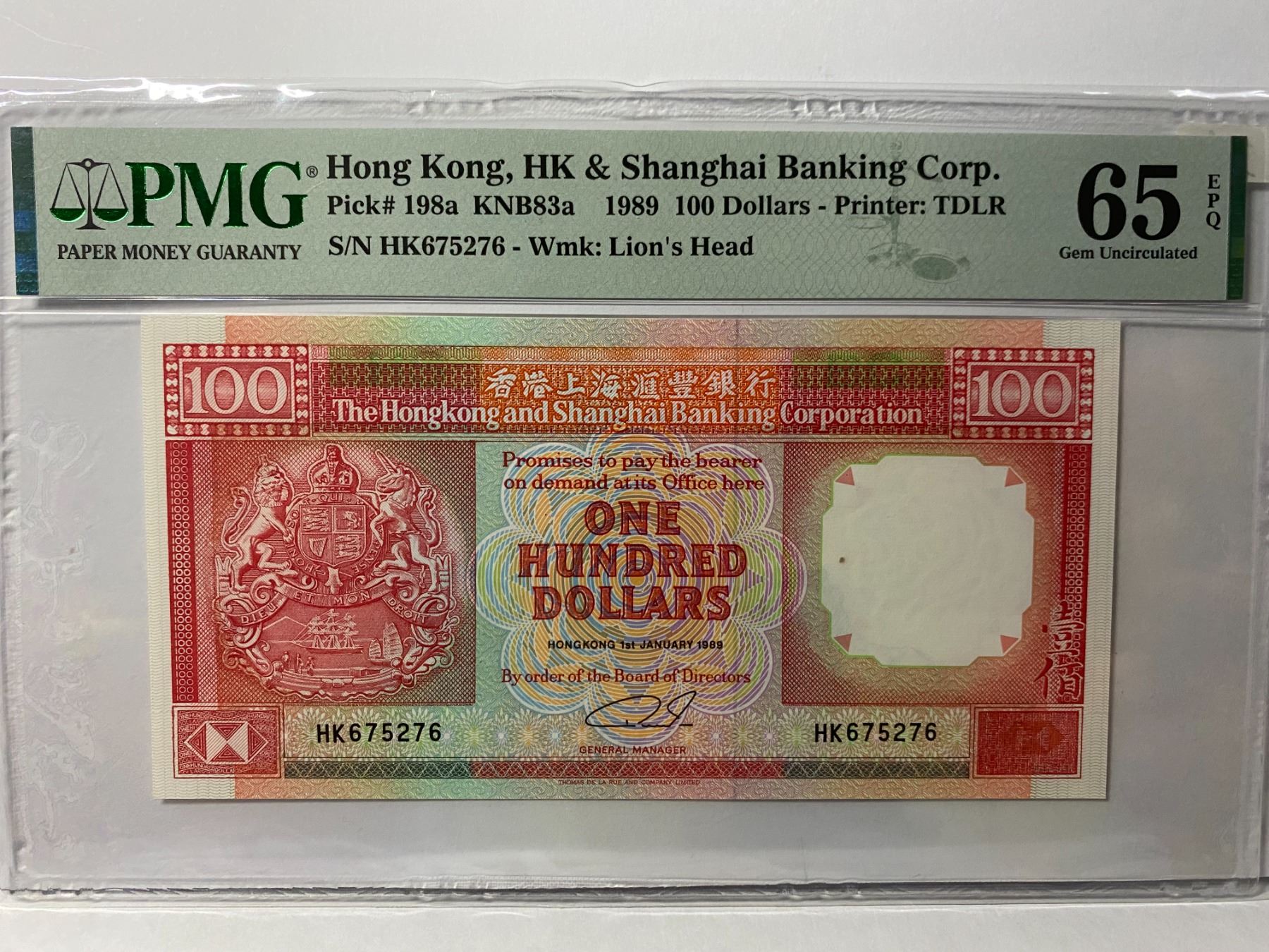 HK 冠, HK675276, 1989 香港匯豐銀行, 100 圓, PMG 65EPQ, Hong Kong Prefix, HK675276, 1989 Hong Kong Shanghai Banking Corp, 100 dollars, PMG 65EPQ