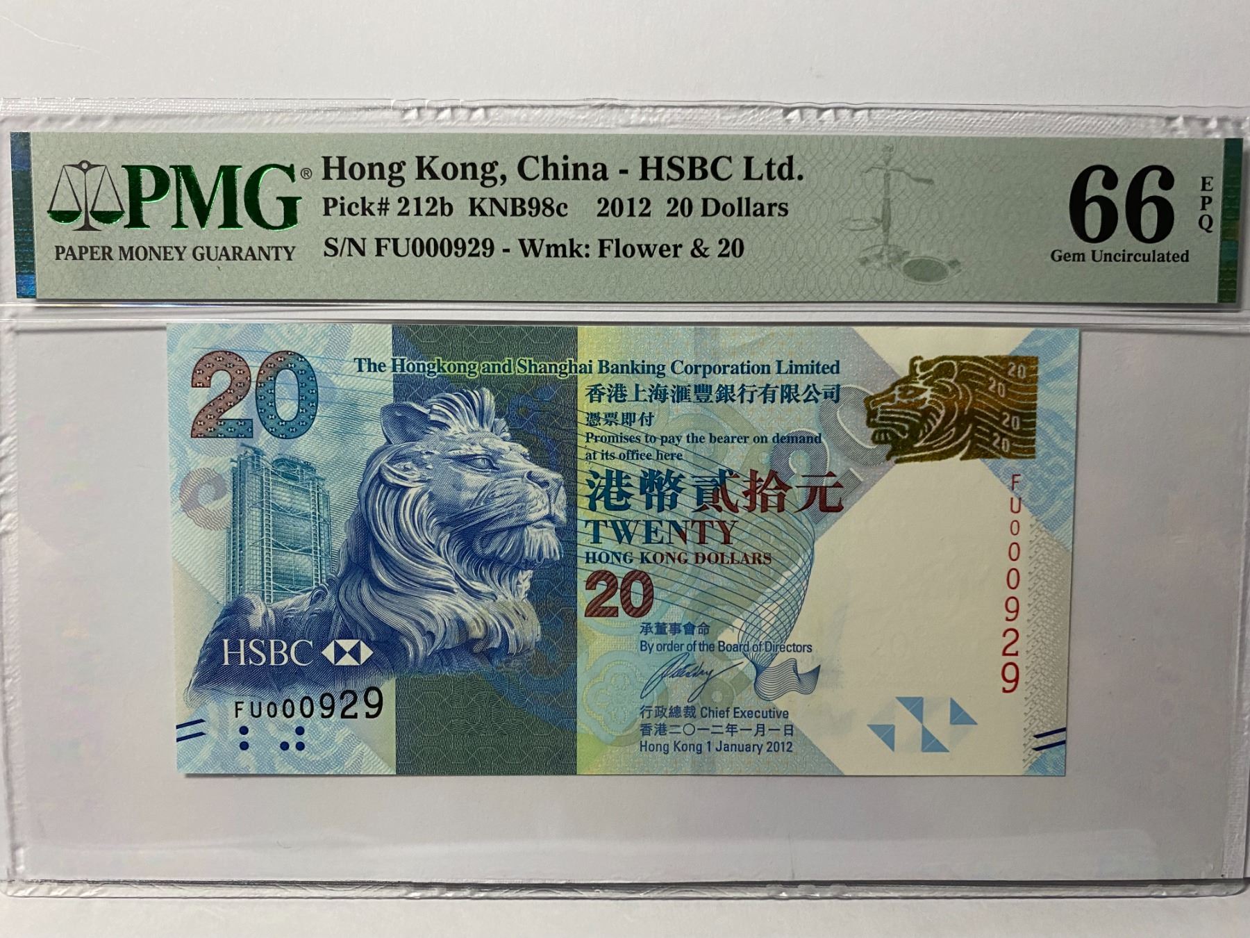 FU000929, 2012 香港匯豐銀行, 20 圓, PMG 66EPQ, FU000929, 2012 Hong Kong Shanghai Banking Corp, 20 dollars, PMG 66EPQ