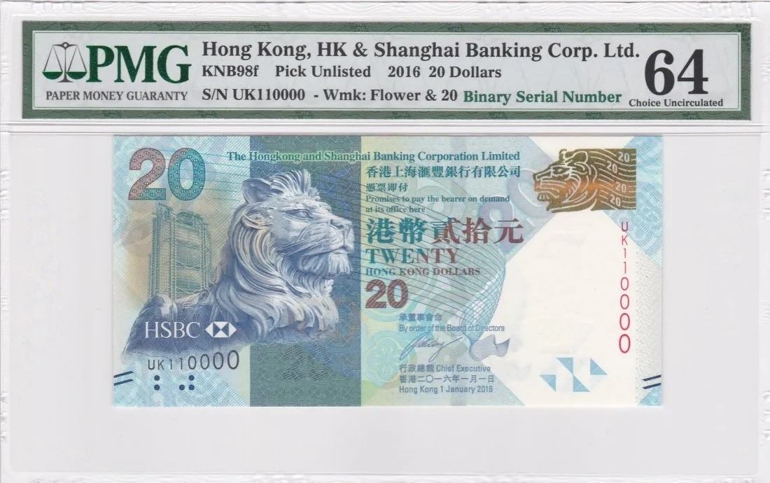 UK110000,二進制號, 2016 香港匯豐銀行, 20 圓, PMG 64, UK110000, Binary Serial Number, 2016 Hong Kong Shanghai Banking Corp, 20 dollars, PMG 64