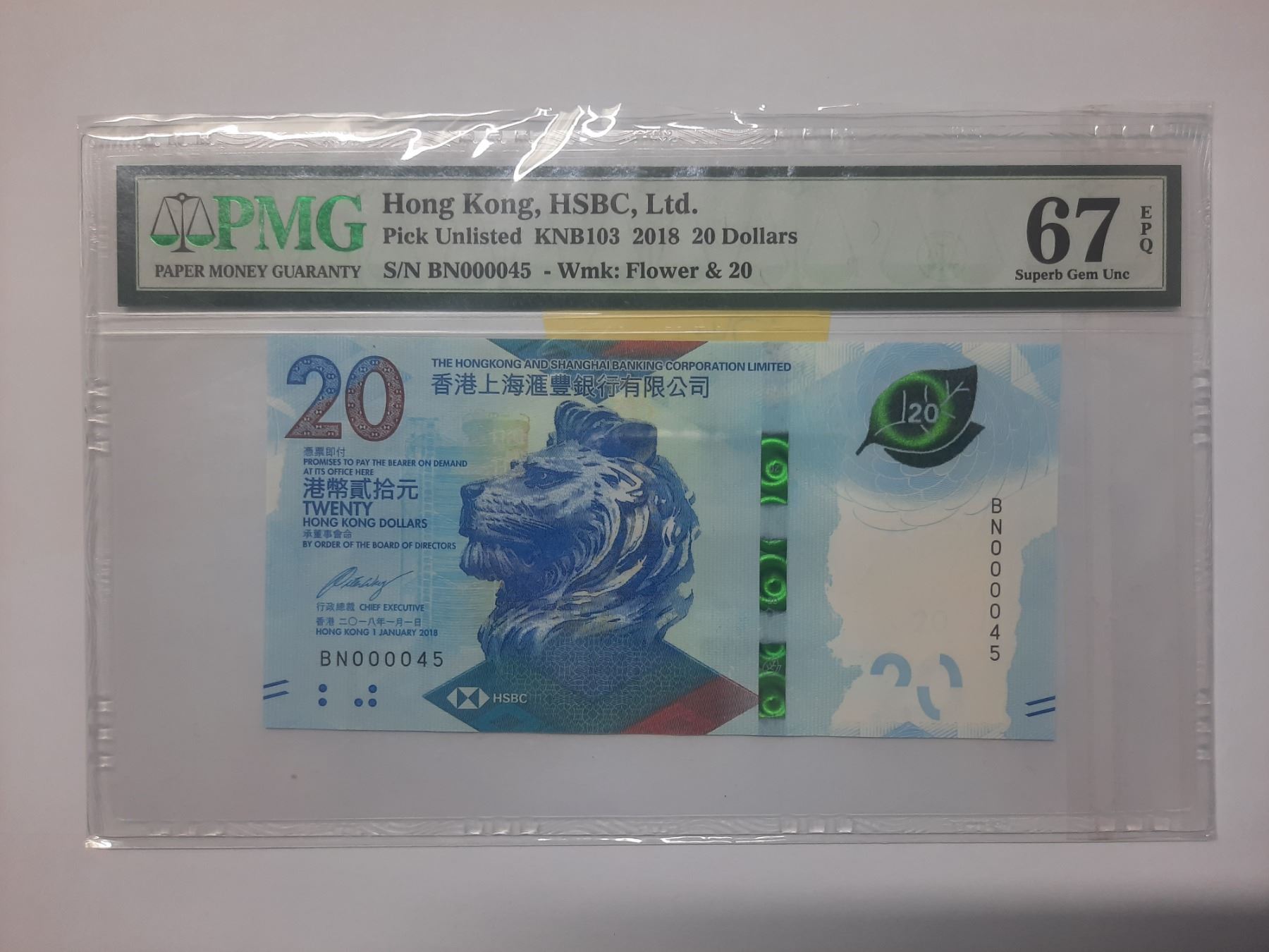 BN000045,細號, 2018 香港匯豐銀行 20 圓, PMG 66EPQ, BN000045, Low Serial Number, 2018 Hong Kong Shanghai Banking Corp 20 dollars, PMG 66EPQ