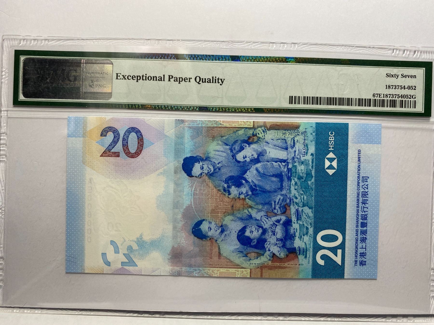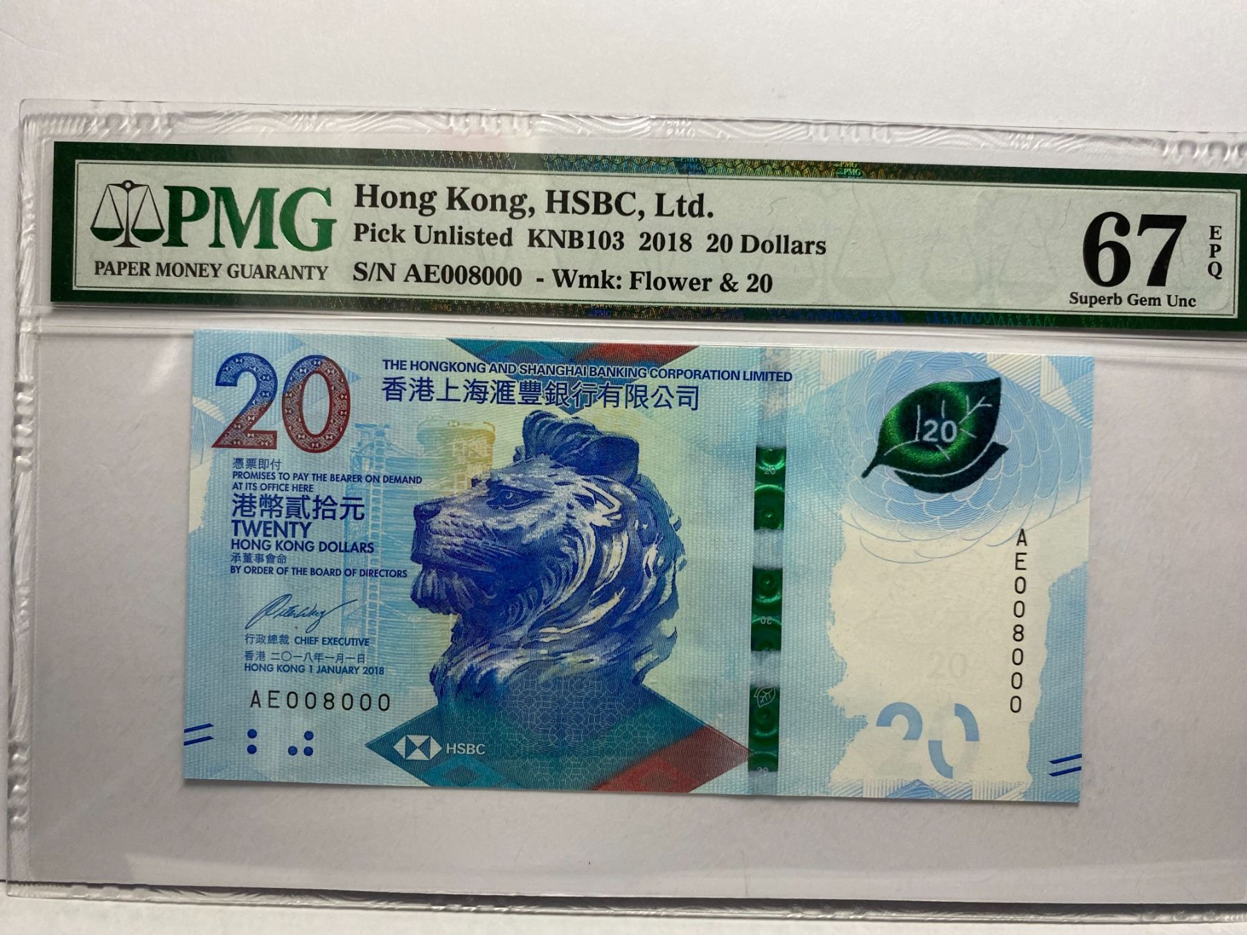 AE008000, 8 千號, 2018 香港匯豐銀行, 20 圓, PMG 67EPQ, AE008000, 8 Thousands Serial Number, 2018 Hong Kong Shanghai Banking Corp, 20 dollars, PMG 67EPQ