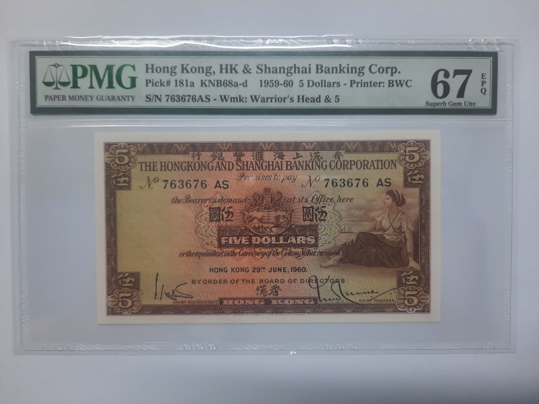 7363676AS, 1960 香港匯豐銀行, 5 圓, PMG 67EPQ, 7363676AS, 1960 Hong Kong Shanghai Banking Corp, 5 dollars, PMG 67EPQ