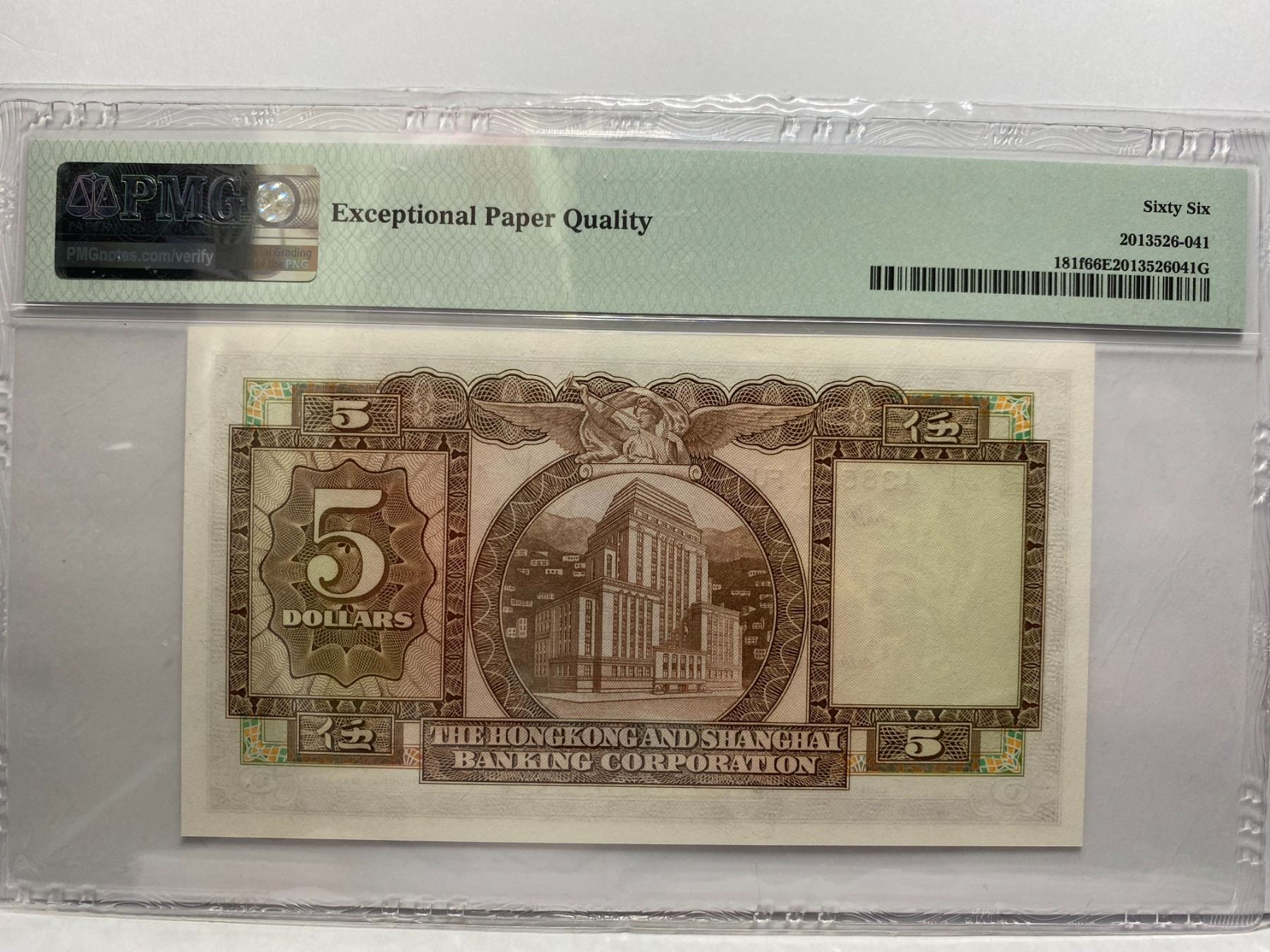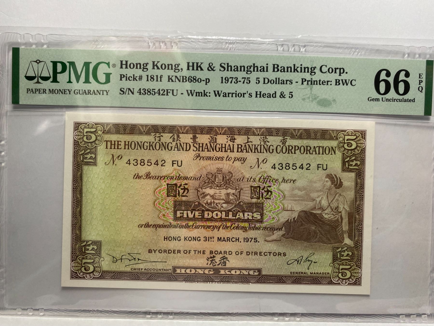 438542FU, 1975 香港匯豐銀行, 5 圓, PMG 66EPQ, 438542FU, 1975 Hong Kong Shanghai Banking Corp, 5 dollars, PMG 66EPQ