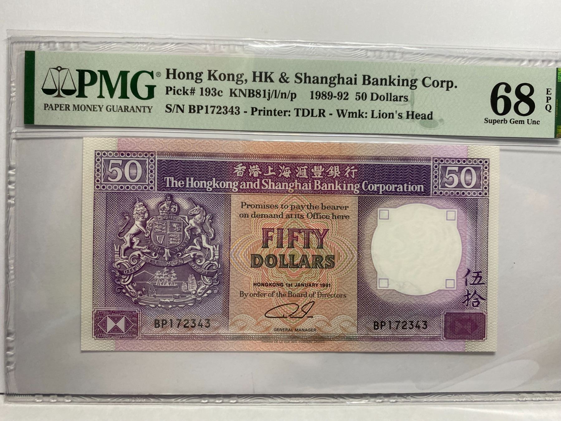 BP172343, 1991 香港匯豐銀行, 50 圓, PMG 68EPQ, BP172343, 1991 Hong Kong Shanghai Banking Corp, 50 dollars, PMG 68EPQ