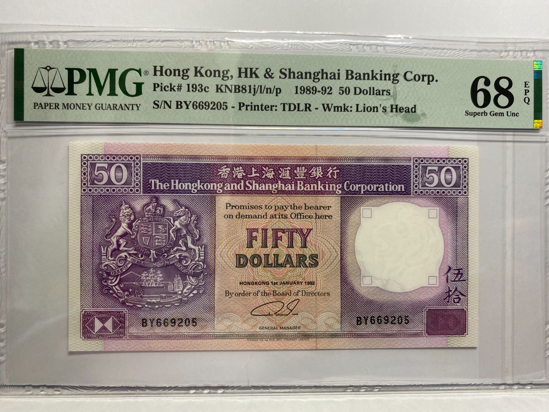 BY669205, 1992 香港匯豐銀行, 50 圓, PMG 68EPQ, BY669205, 1992 Hong Kong Shanghai Banking Corp, 50 dollars, PMG 68EPQ