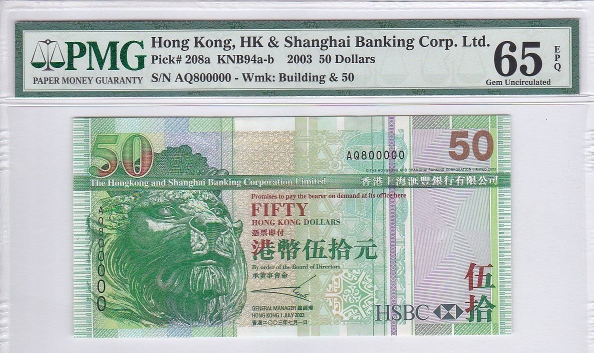 Hong Kong, Shanghai Banking Corp, 50 dollars, 2003, S/N. AQ800000, P-208a, PMG 65EPQ eighty hundred thousand Serial Number