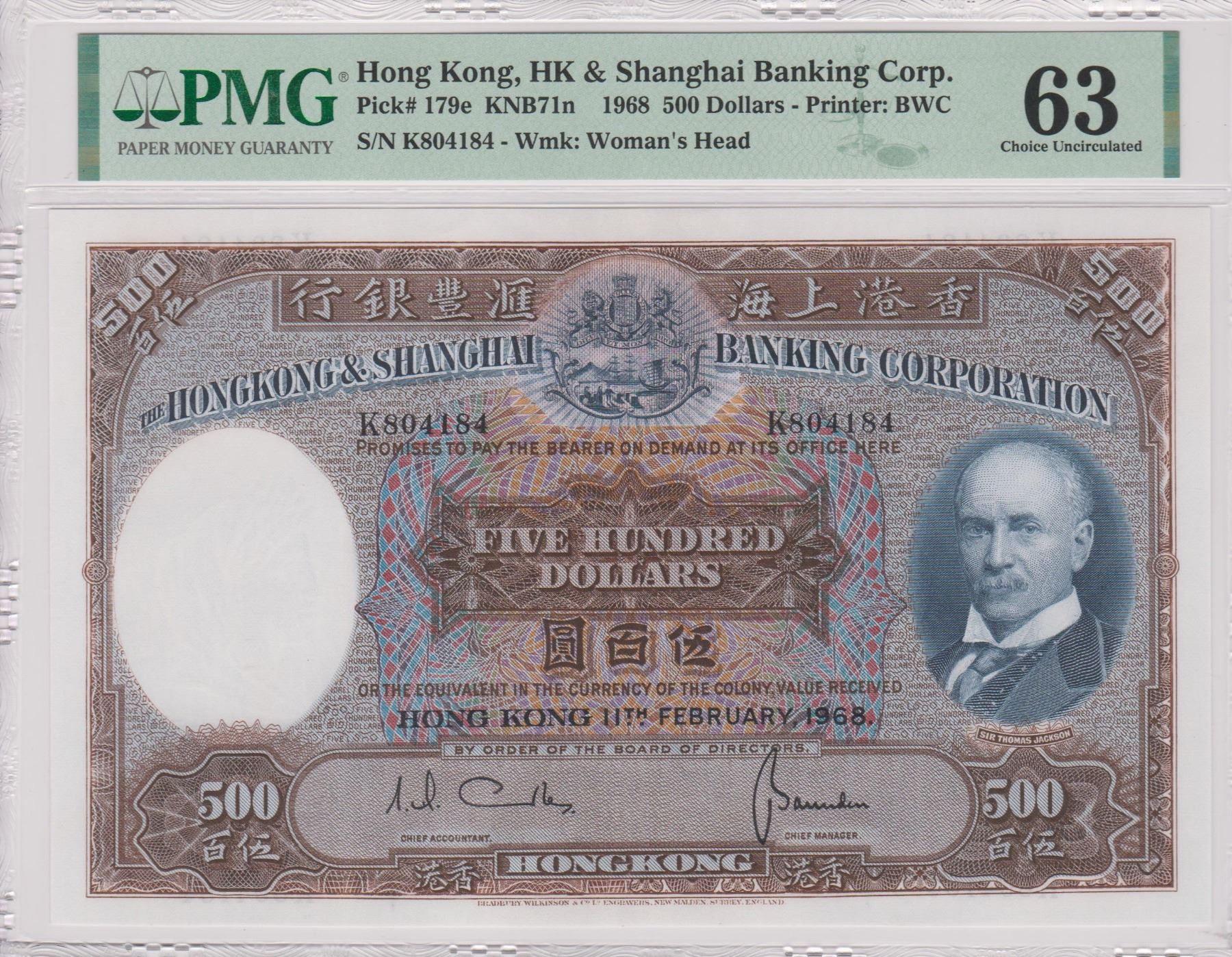 Hong Kong, Shanghai Banking Corp, 500 dollars, 1968, S/N. K804184, P-179e, PMG 63