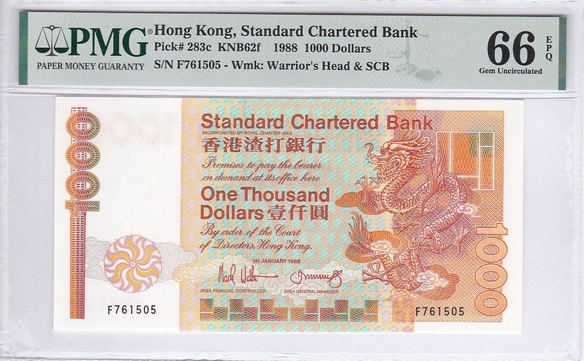 Hong Kong, Standard Chartered Bank, 1000 dollars, 1988, S/N. F761505, P-283c, PMG 66EPQ