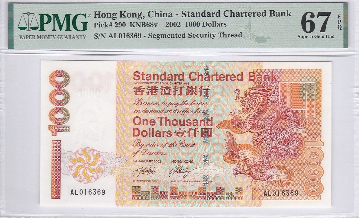 Hong Kong, Standard Chartered Bank, 1000 dollars, 2002, S/N. AL016369, P-290, PMG 67EPQ