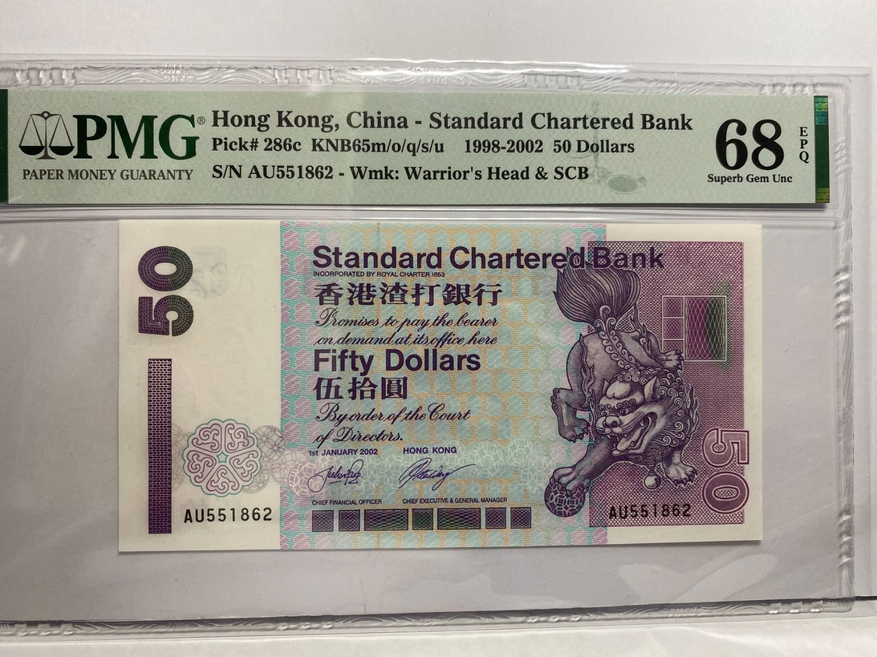 AU551862, 2002 香港渣打銀行, 50 圓, PMG 68EPQ, AU551862, 2002 Hong Kong Standard Chartered Bank, 50 dollars, PMG 68EPQ