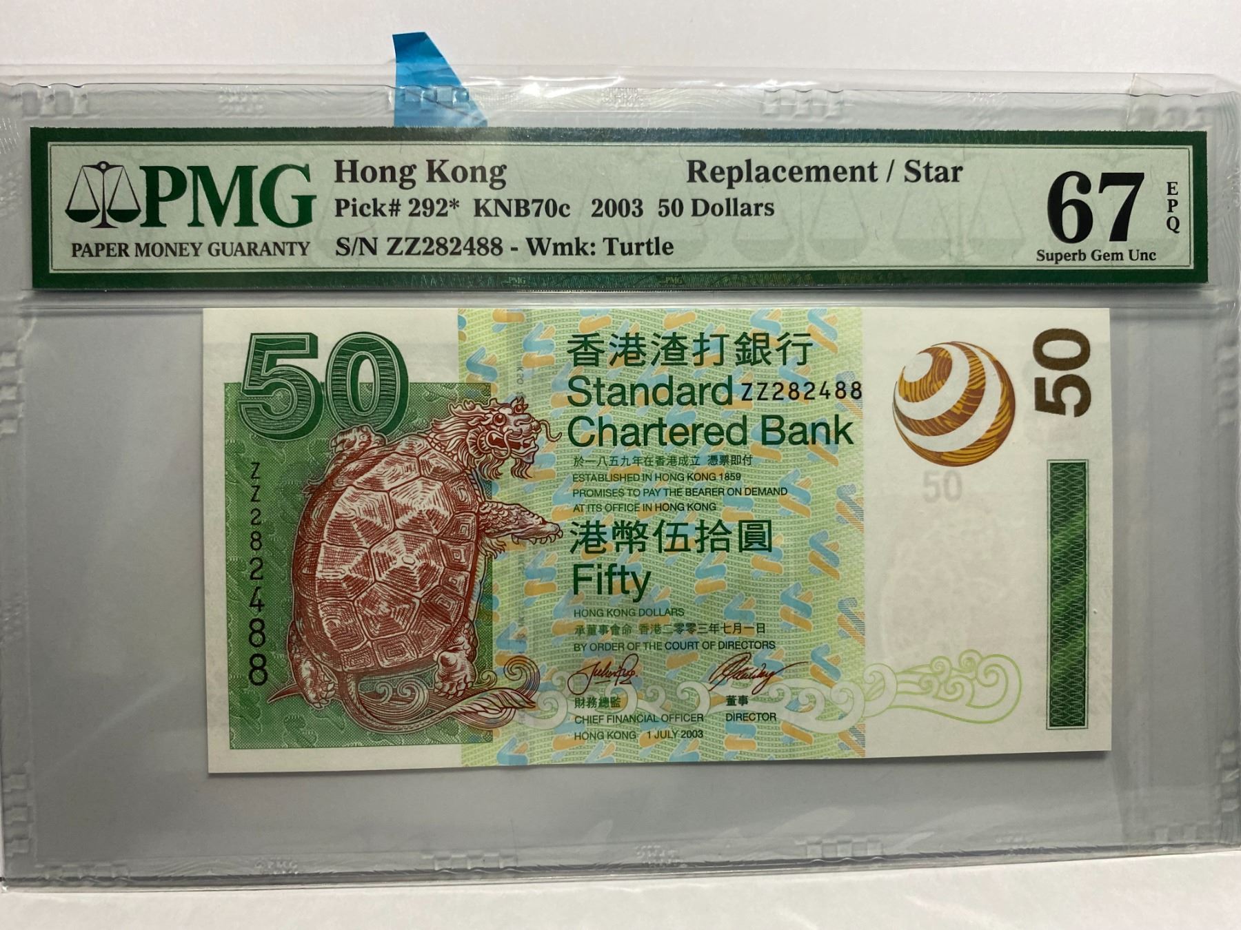 ZZ282488 補版, 2003 香港渣打銀行, 50 圓, PMG 67EPQ, ZZ282488 Replacement, 2003 Hong Kong Standard Chartered Bank, 50 dollars, PMG 67EPQ