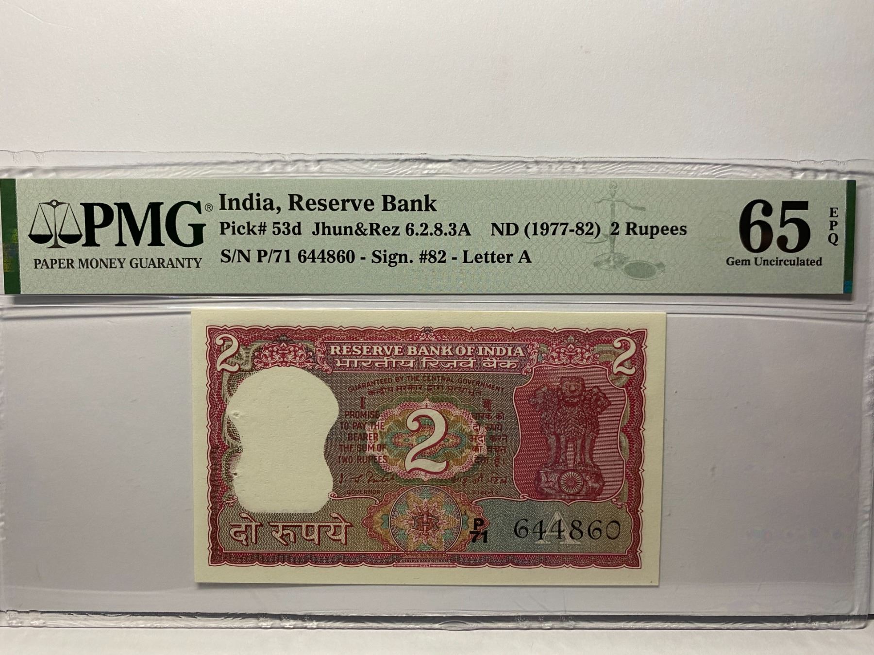 P/71 644860, ND 1977-82 印度,2 盧比, PMG 65EPQ, P/71 644860, ND 1977-82 India, Reserve Bank, 2 Rupees, PMG 65EPQ