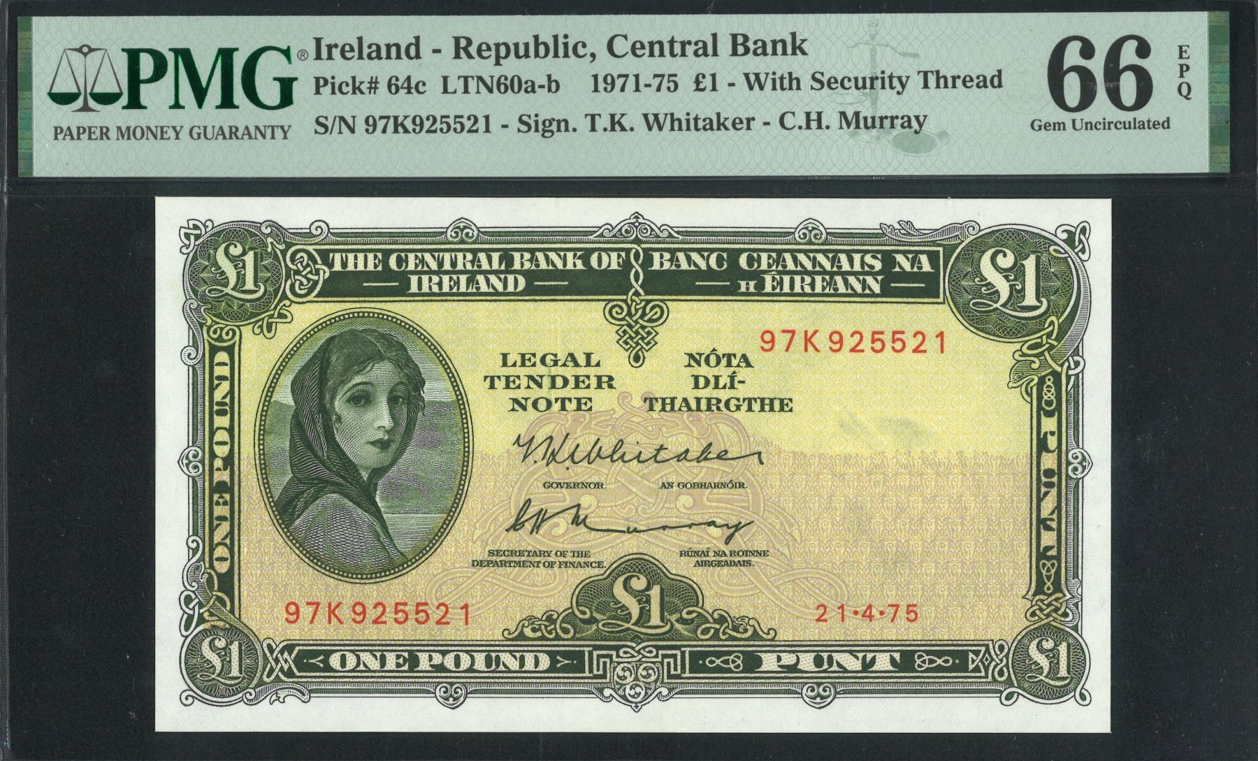 1971-75, 愛爾蘭, 1 鎊, 編號: 97K925521. PMG 66EPQ.