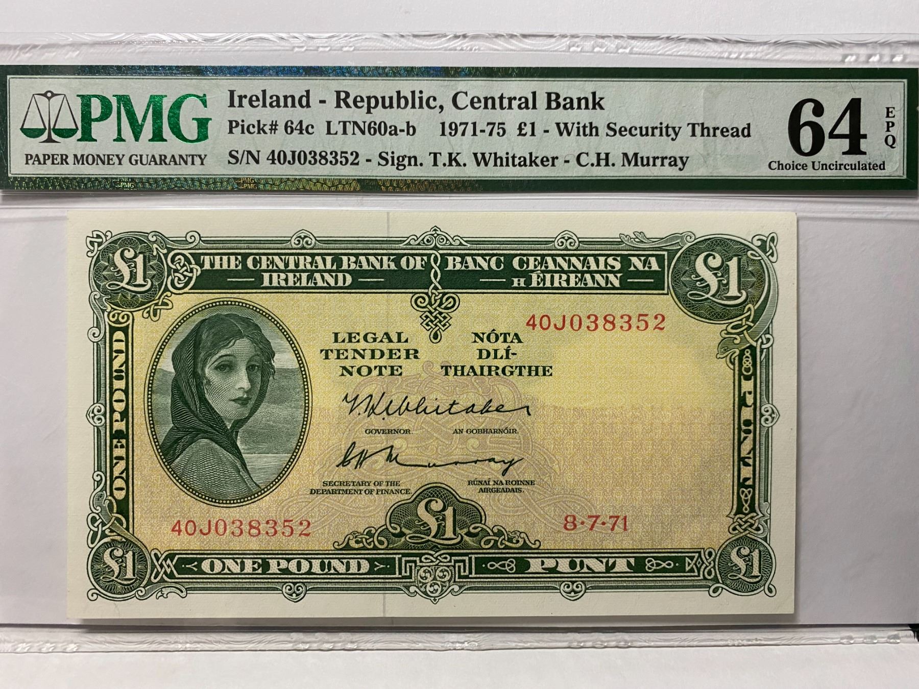 40J038352, 1971-75 愛爾蘭 , 1 鎊, PMG 64EPQ, 40J038352, 1971-75 Ireland Republic Central Bank, 1 Pound, PMG 64EPQ