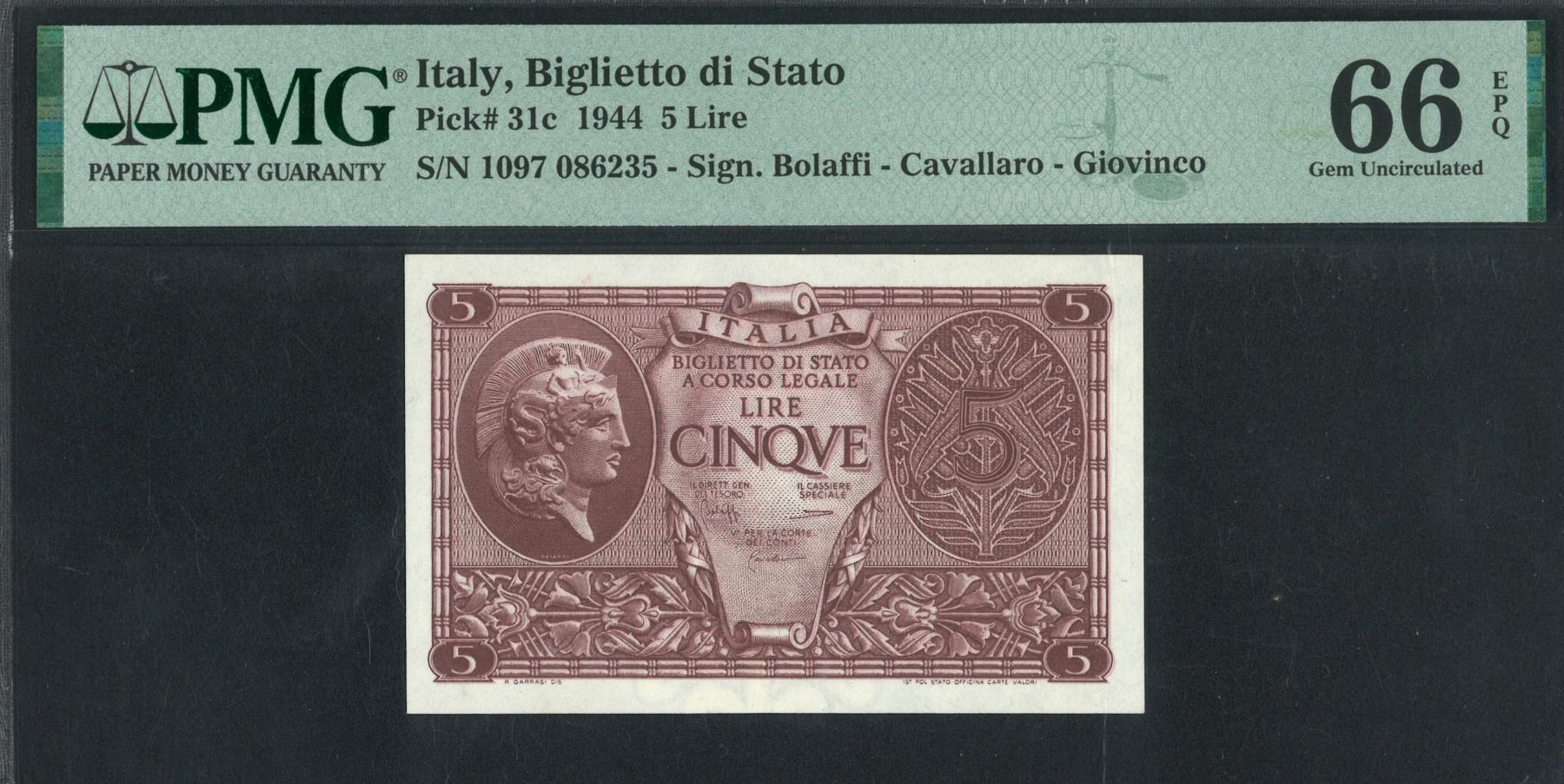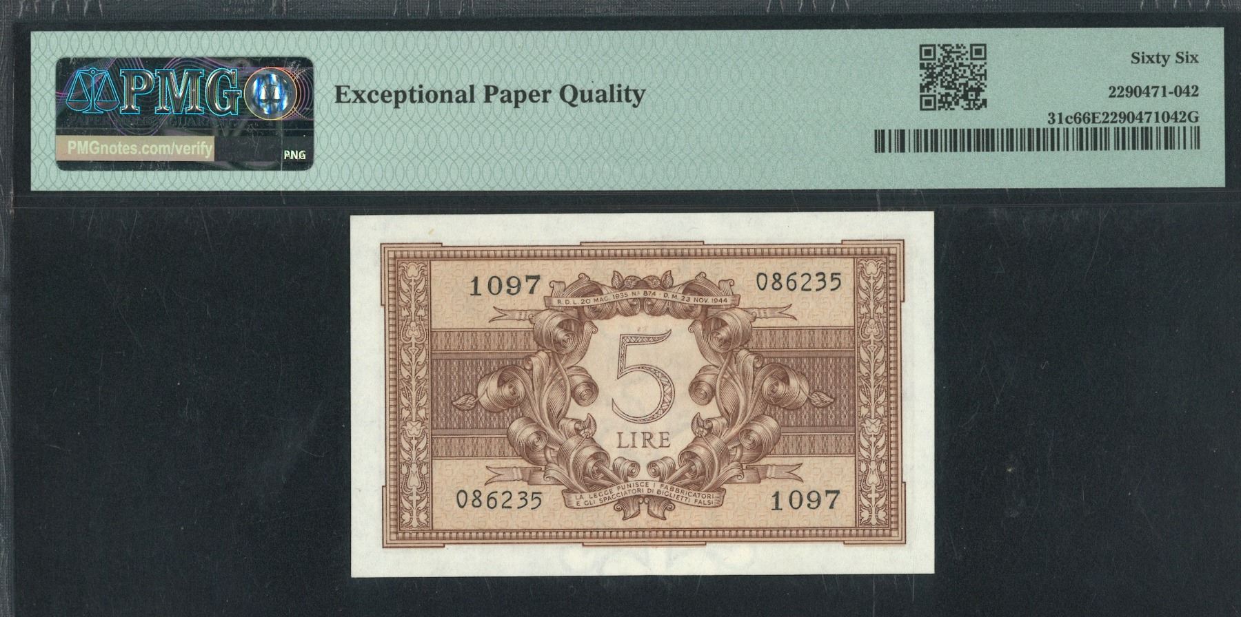 1944, 意大利, 5 里拉, 編號: 1097 086235, PMG 66EPQ.