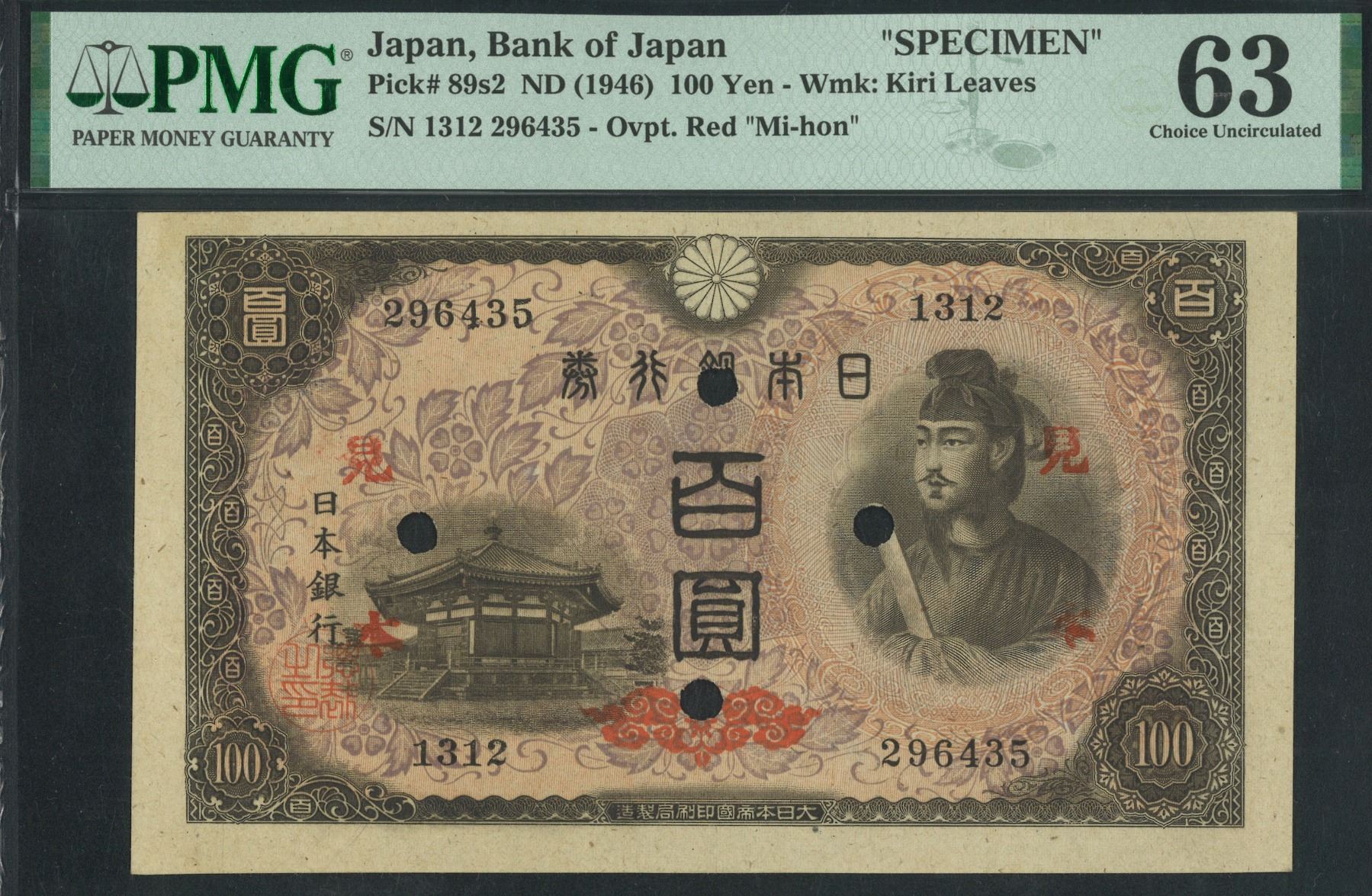 ND (1946), 日本, 100 日圓, 列號: 1312 296435. 樣票, PMG 63 微裂. 少見