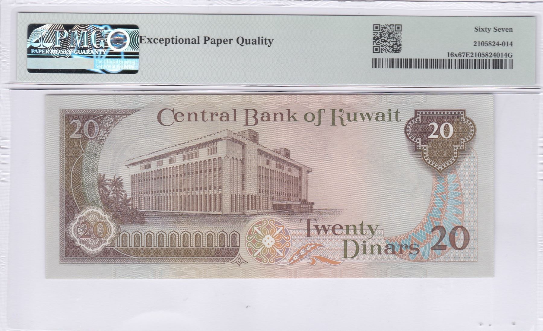 1968 (ND 1986- 91), 科威特, 20 第納爾, WJ/10 205148. PMG 67EPQ. 波斯灣戰爭被伊拉克軍隊所盗鈔票