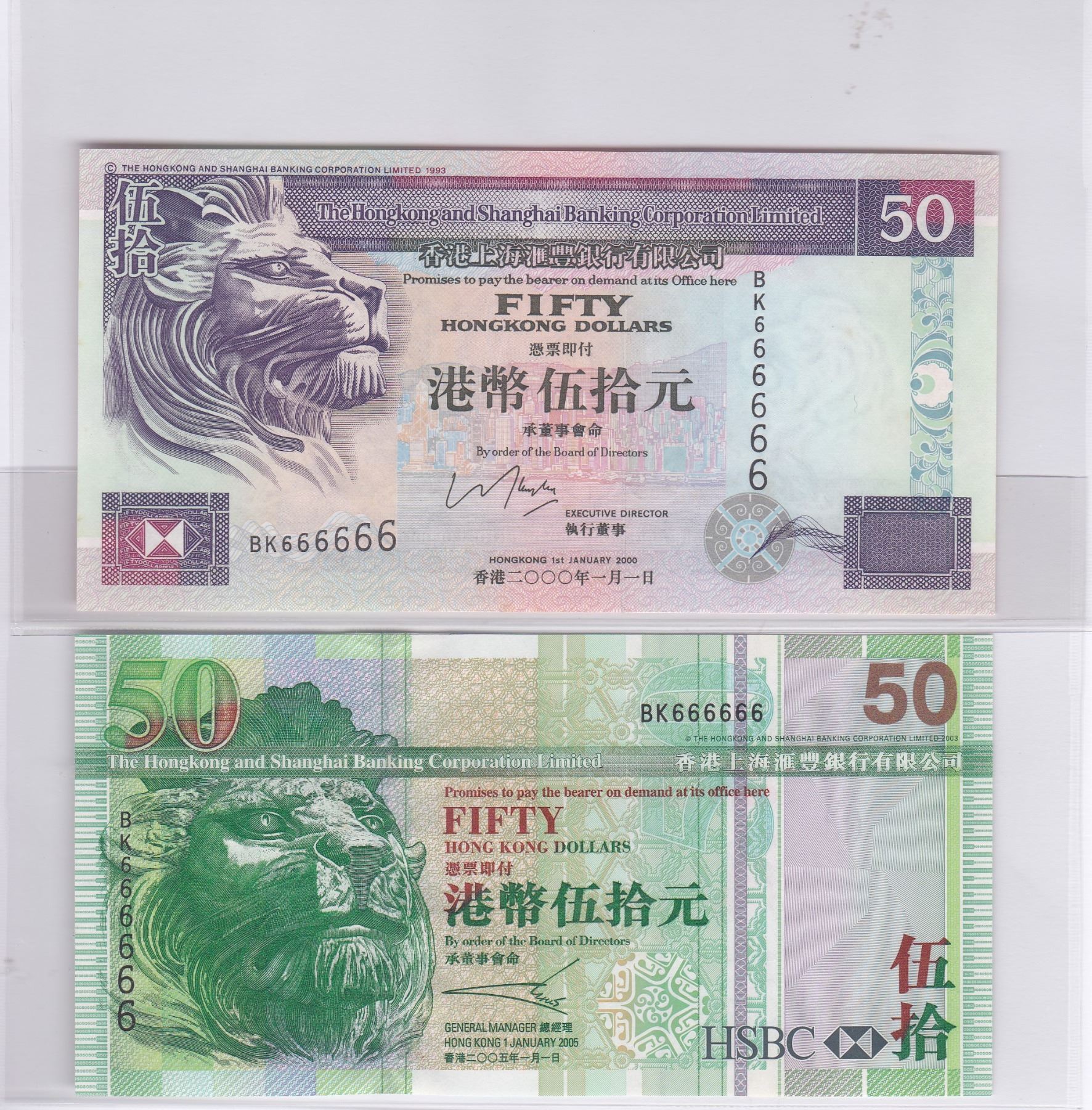 2000 & 2005, 匯豐銀行, $50一對兩張, 同冠同號: BK666666. 兩者皆極佳全新直版品. 幸運號全6