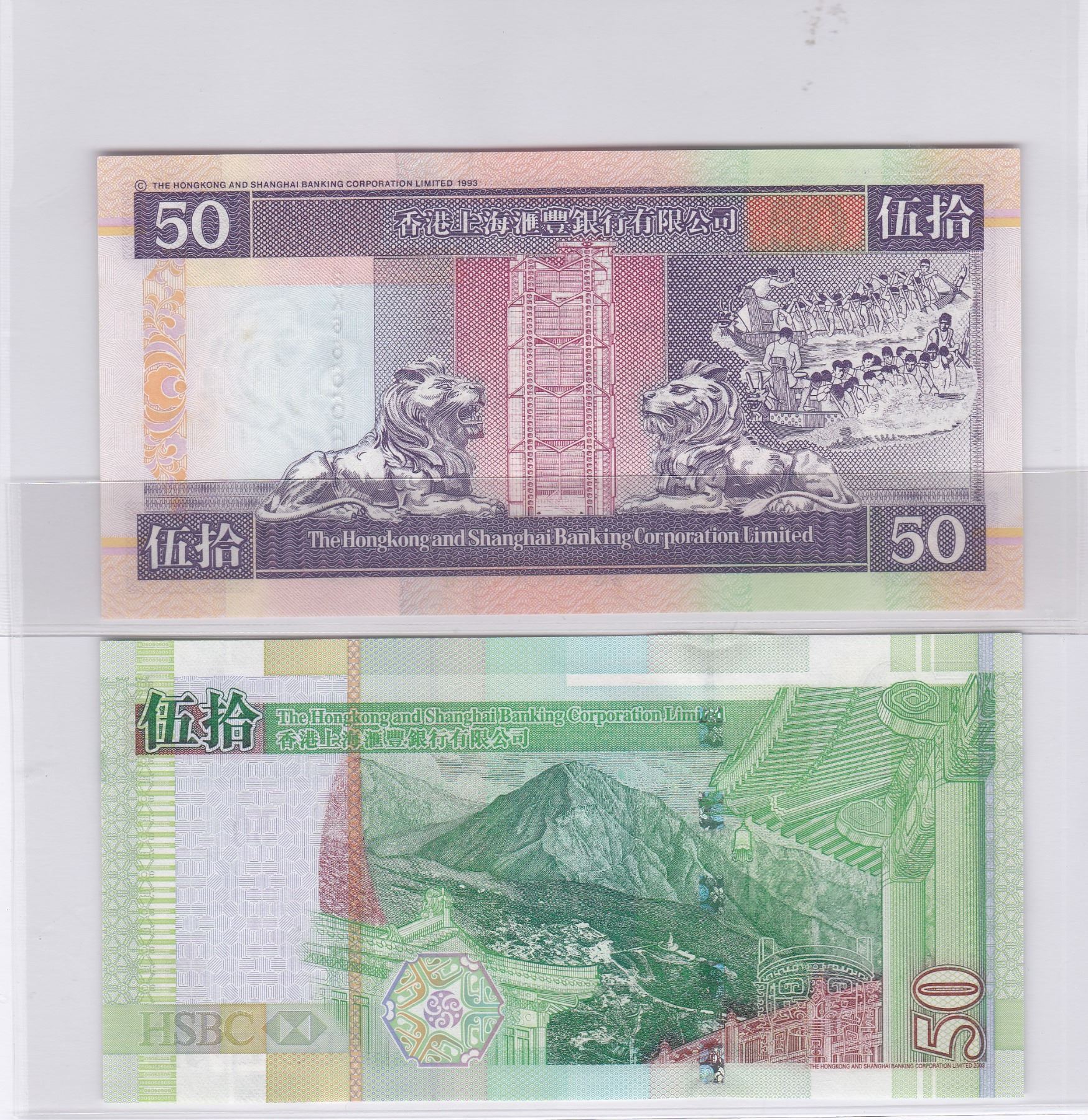 Lot of 2. HK & Shanghai Banking Corp. 2000 & 2005. $50, Same S/N: BK666666. Both are great UNC condi