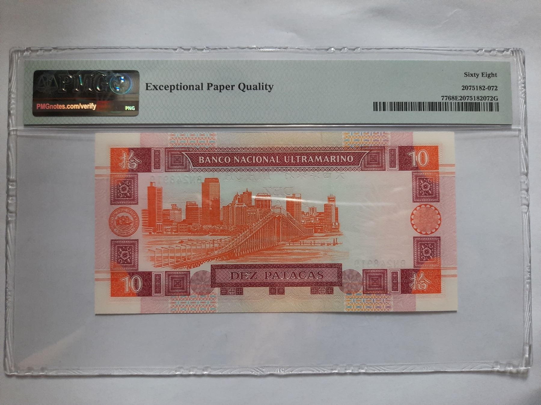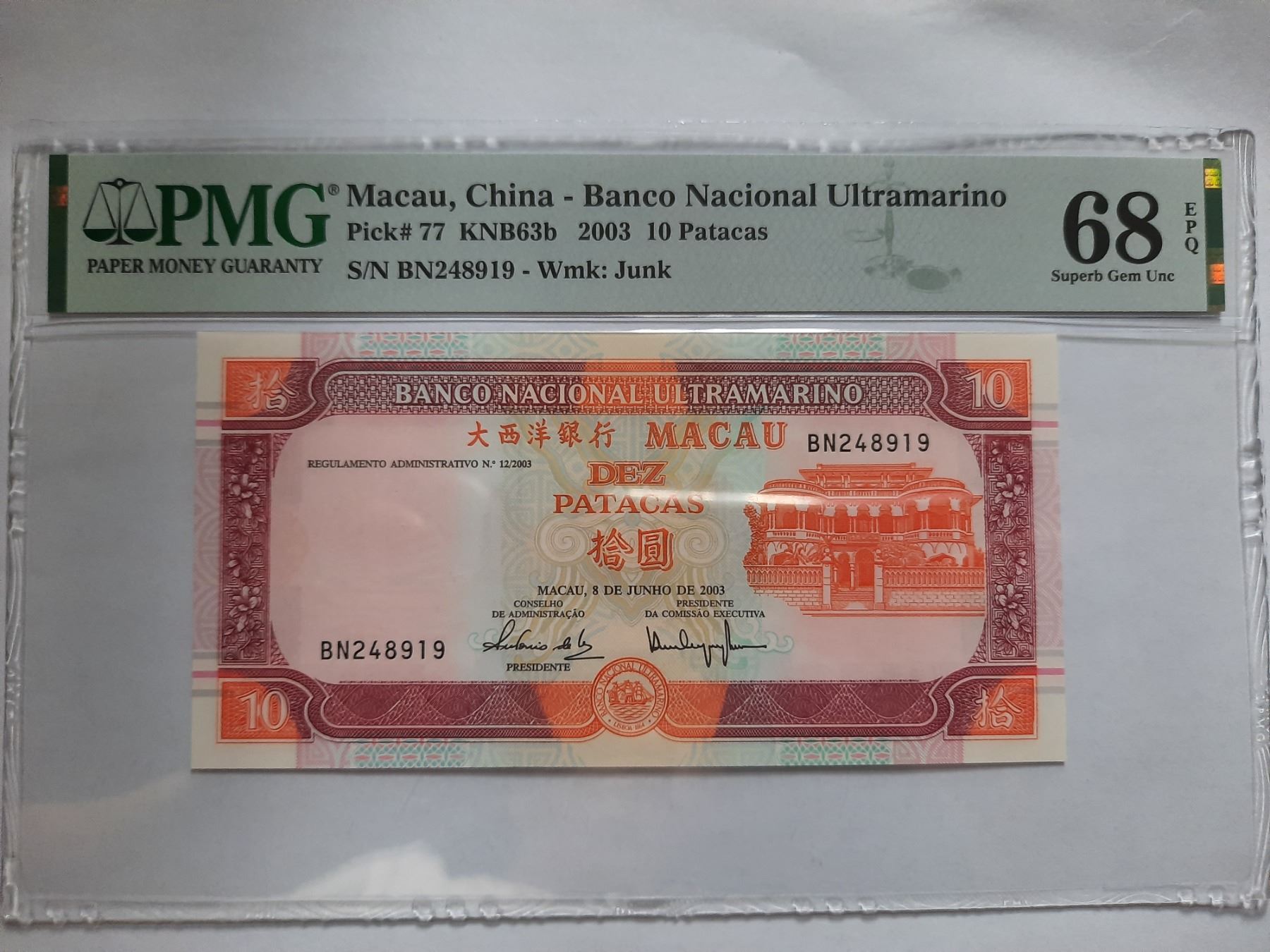 BN248919, 2003 澳門大西洋銀行, 10 Patacas, PMG 68EPQ, BN248919, 2003 Macau China, Banco Nacional Ultramarino, 10 Patacas, PMG 68EPQ