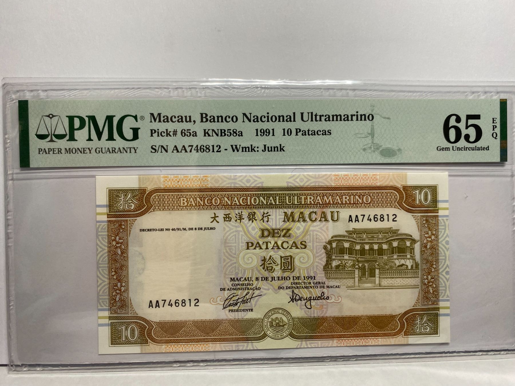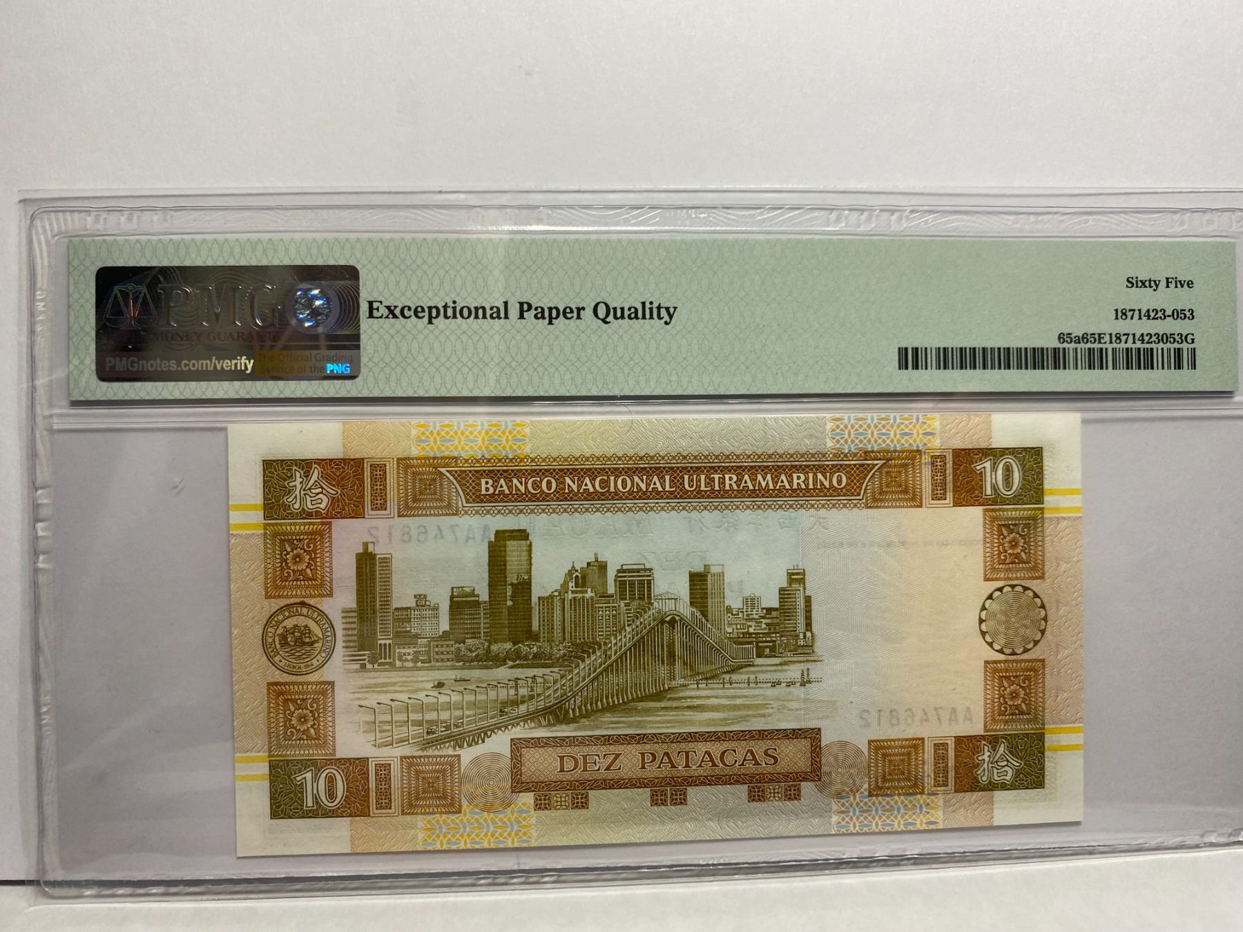 AA746812, A 冠A, 1991 澳門大西洋銀行, 10 Patacas, PMG 65EPQ, AA746812, Prefix AA, 1991 Macau, Banco Nacional Ultramarino, 10 Patacas, PMG 65EPQ