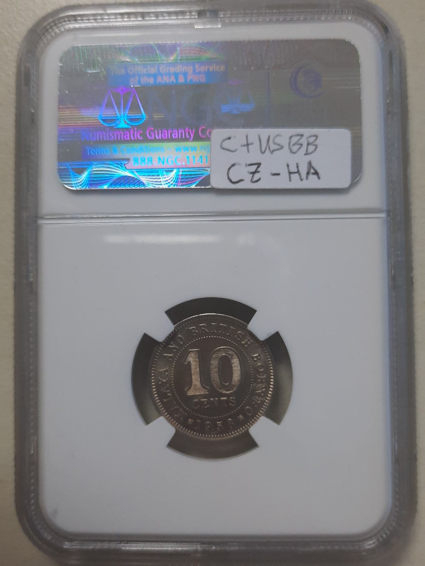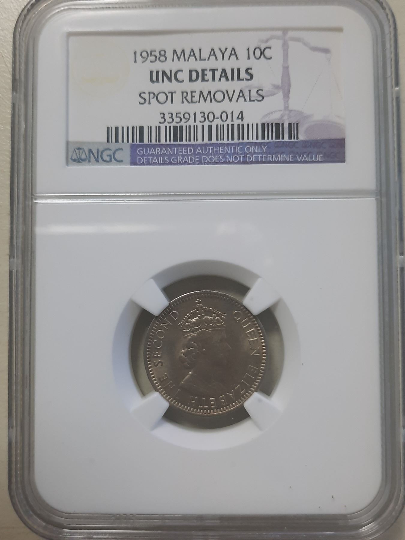 馬來西亞 1958, 10 仙 硬幣, NGC UNC 3359130-014, Malaya 1958, 10 cents coin, NGC UNC 3359130-014