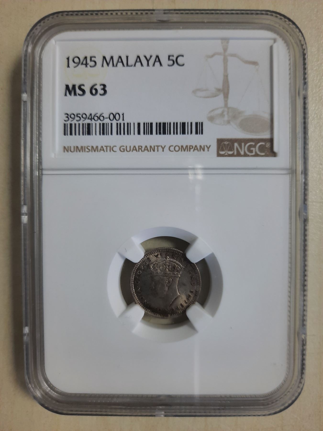 馬來西亞, 5 仙 銀幣, 1945, NGC MS63, Malaya, 5 cents silver coin, 1945, NGC MS63