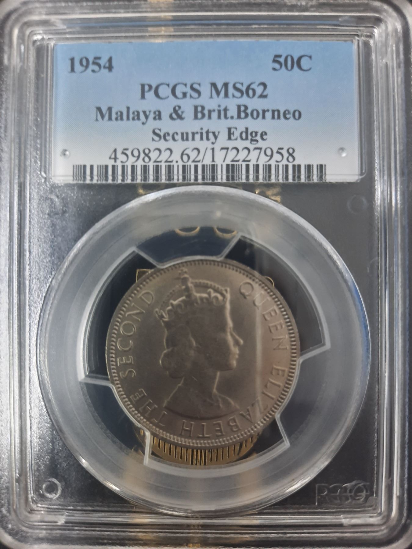 英屬馬來西亞, 50 仙 硬幣, 1954, Security Edge, PCGS MS62, Malaya & Britian Borneo, 50 cents coin, 1954, Security Edge, PCGS MS62