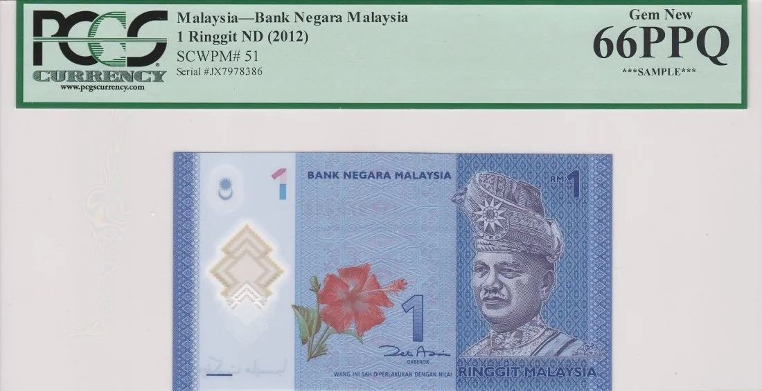 JX7978386, PCGS Currency Sample, ND 2012 Malaysia Bank Negara 1 Ringgit, PCGS Currency 66PPQ