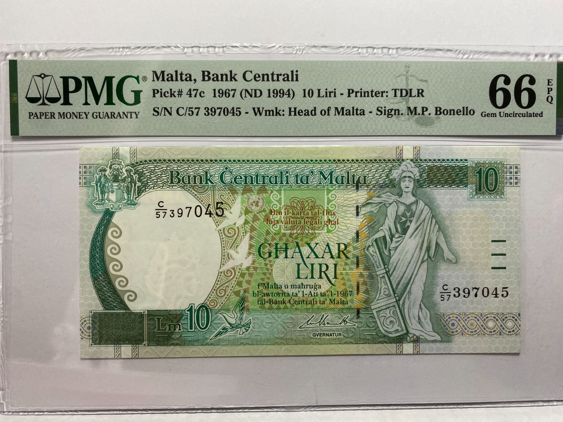 C/57 397045, ND 1994 馬爾他中央銀行 10 Liri, PMG 66EPQ, C/57 397045, ND 1994 Malta, Bank Centrali, 10 Liri, PMG 66EPQ