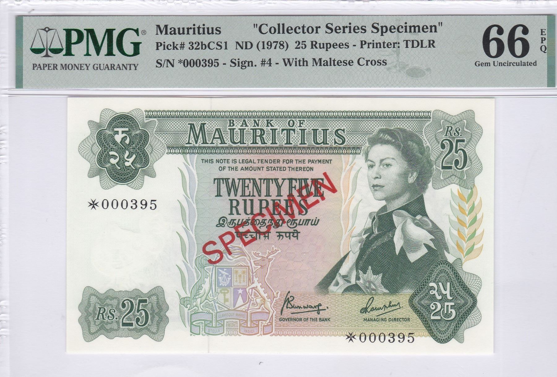 Mauritius, ND (1978), Collector Serial Specimen, 25 Rupees, *000395. PMG 66EPQ. Low Serial NO; 395