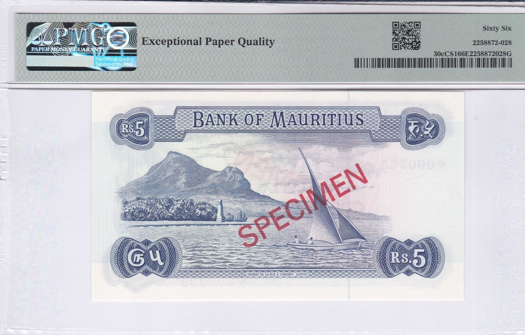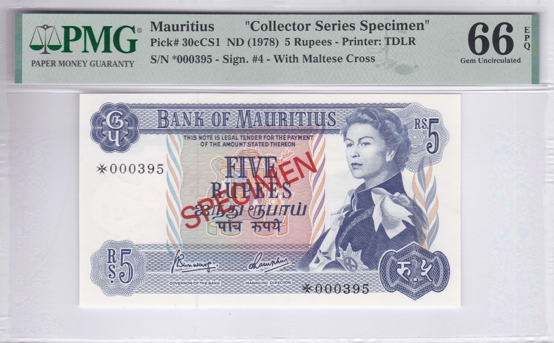 ND (1978), 毛里裘斯, 收藏家系列樣票, 5 盧比, 編號:*000395. PMG 66EPQ. 細序號:395