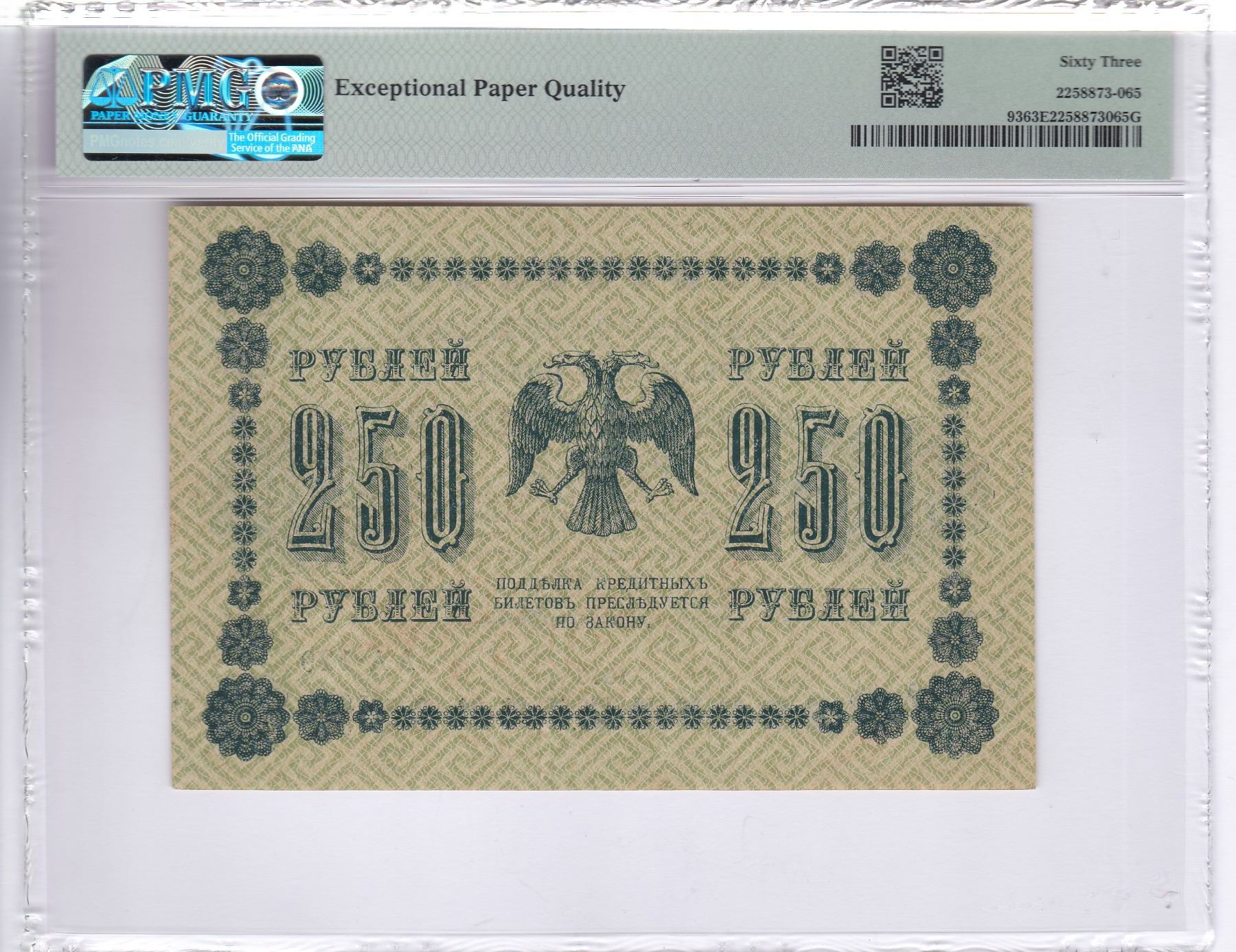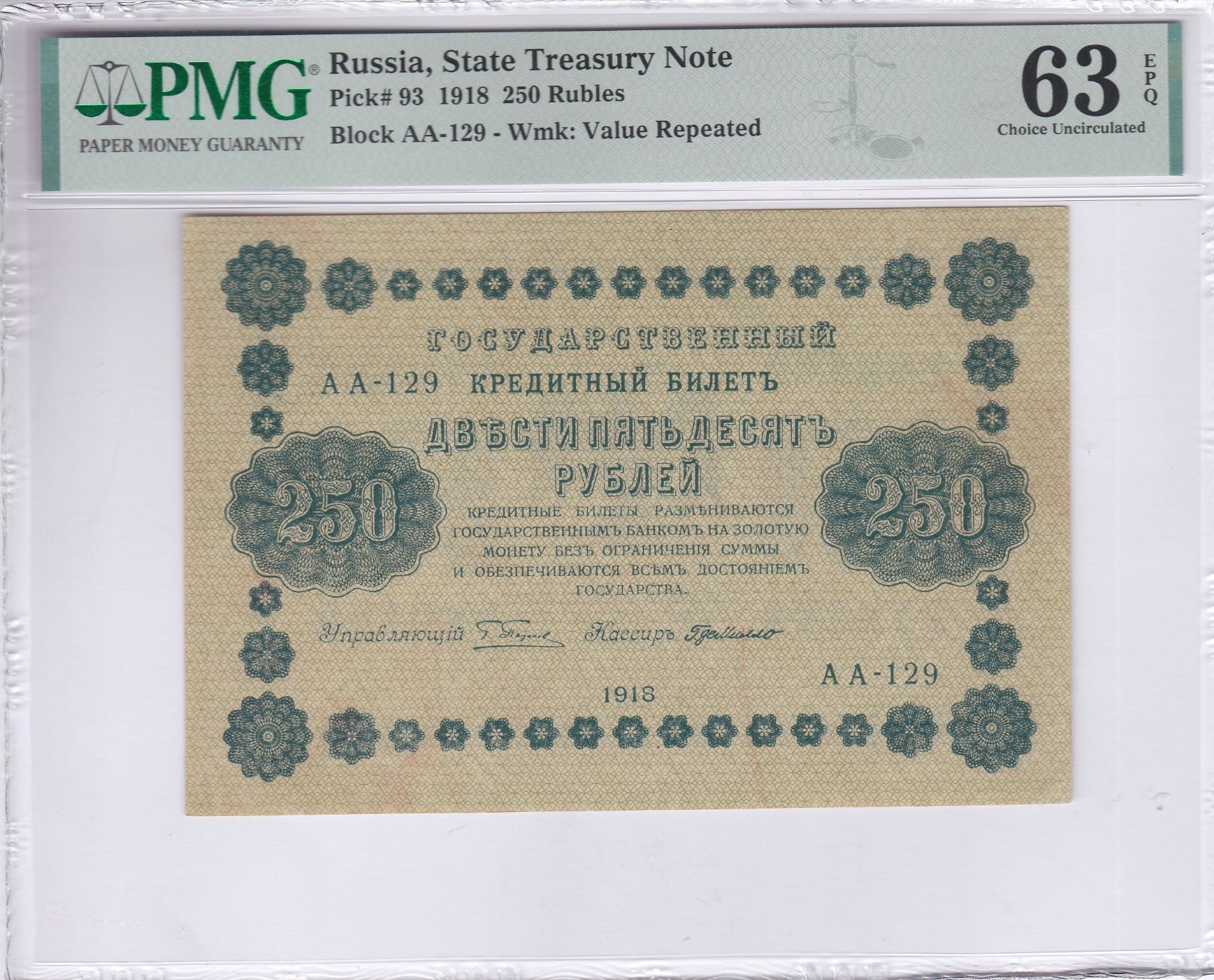 1918, 俄羅斯, 250 盧布, 編號: Block AA-129. PMG 63EPQ.