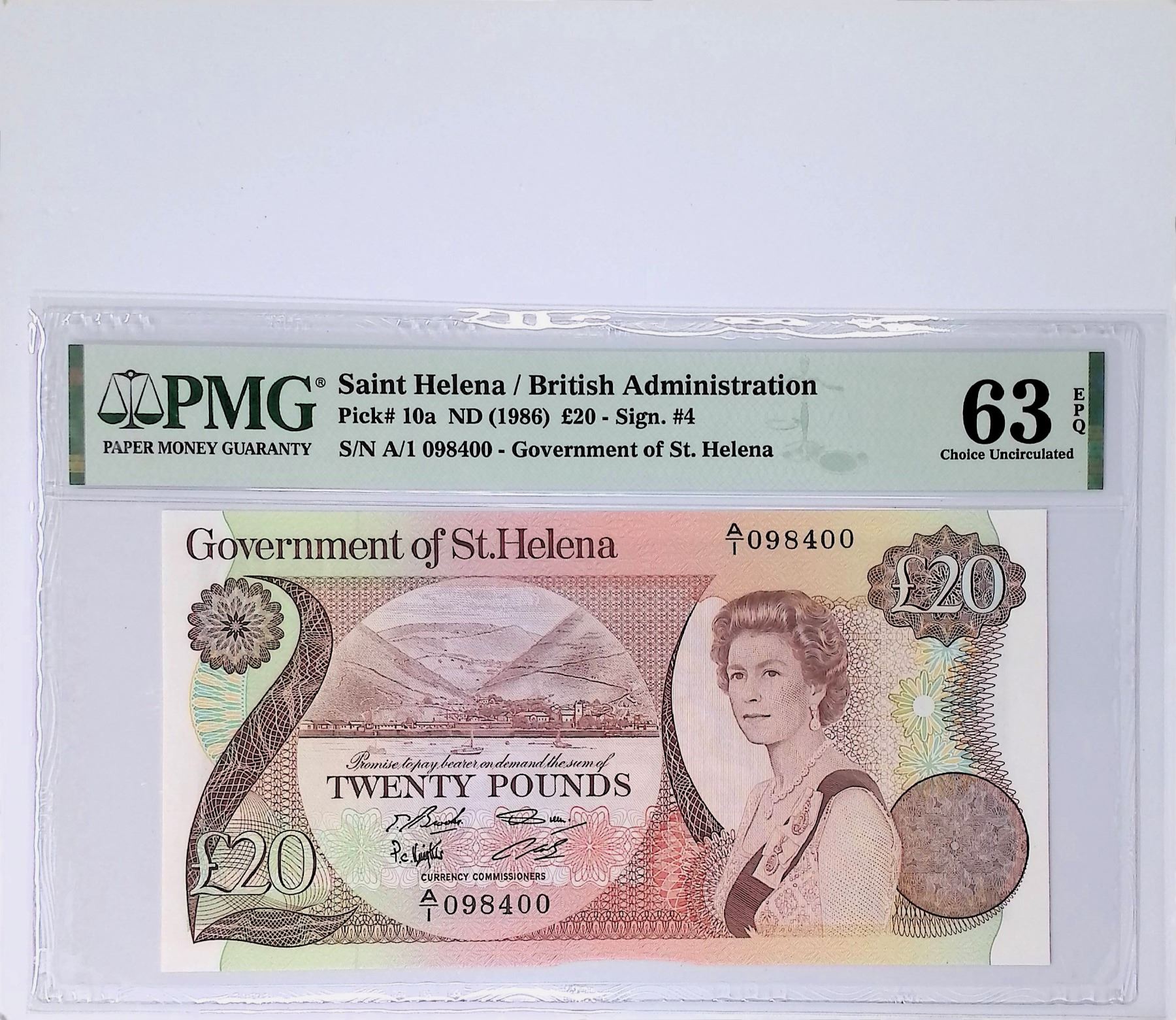 Saint Helena ND (1986), 20 pound A/1 098400 PMG 63EPQ