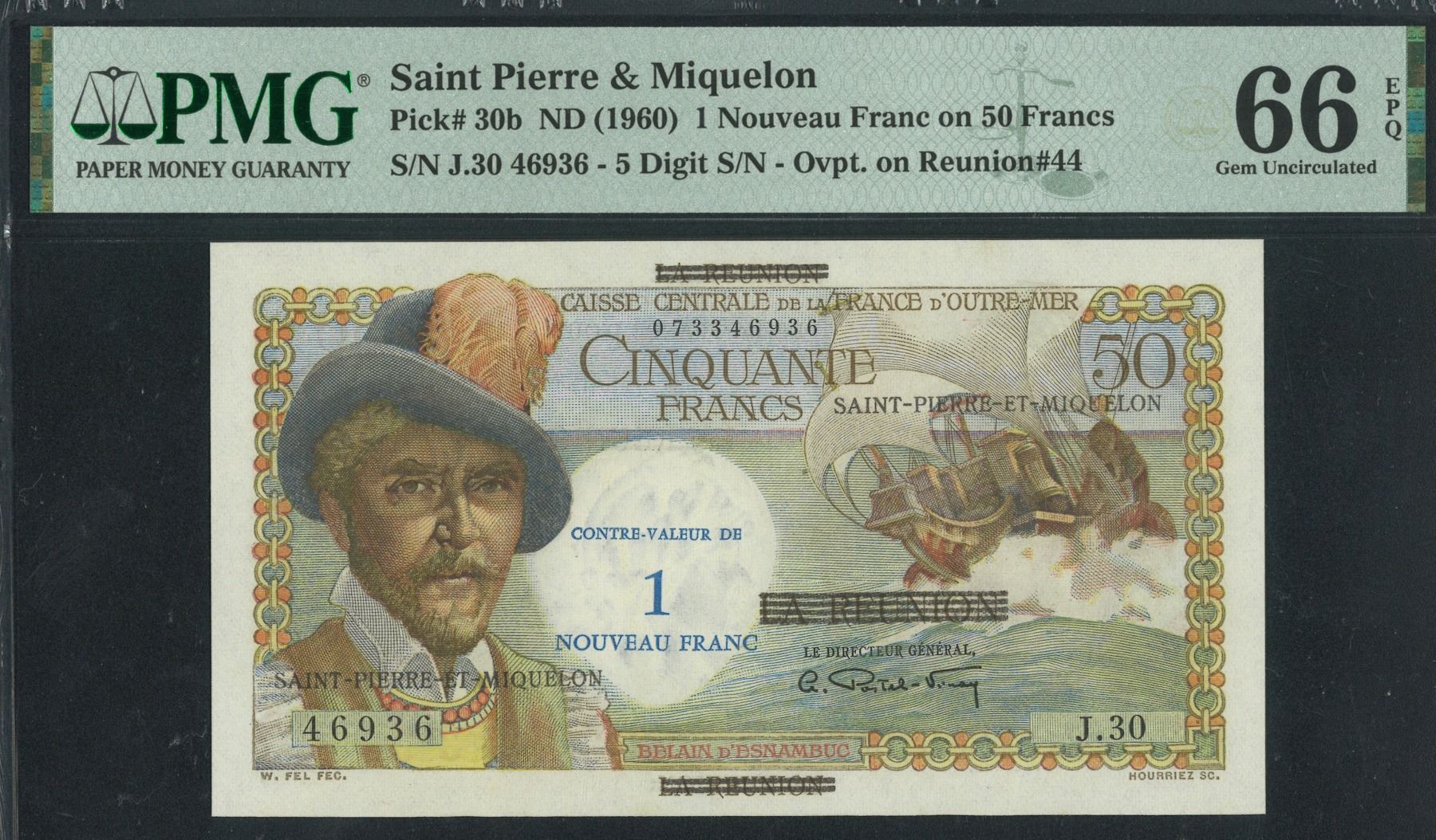ND (1960), 聖皮耶與密克隆, 加蓋1NF, 編號: J.30 46936. PMG 66EPQ.