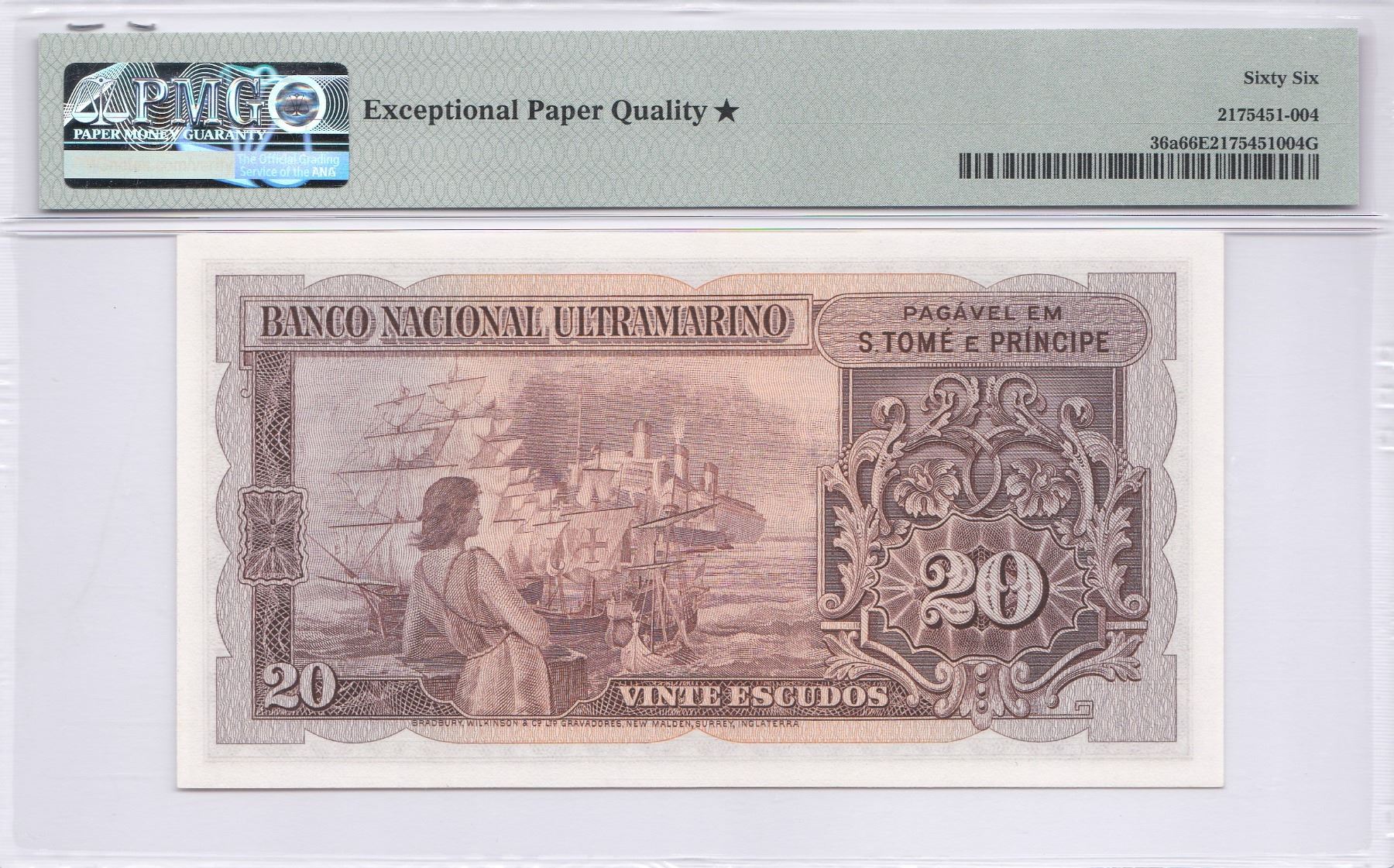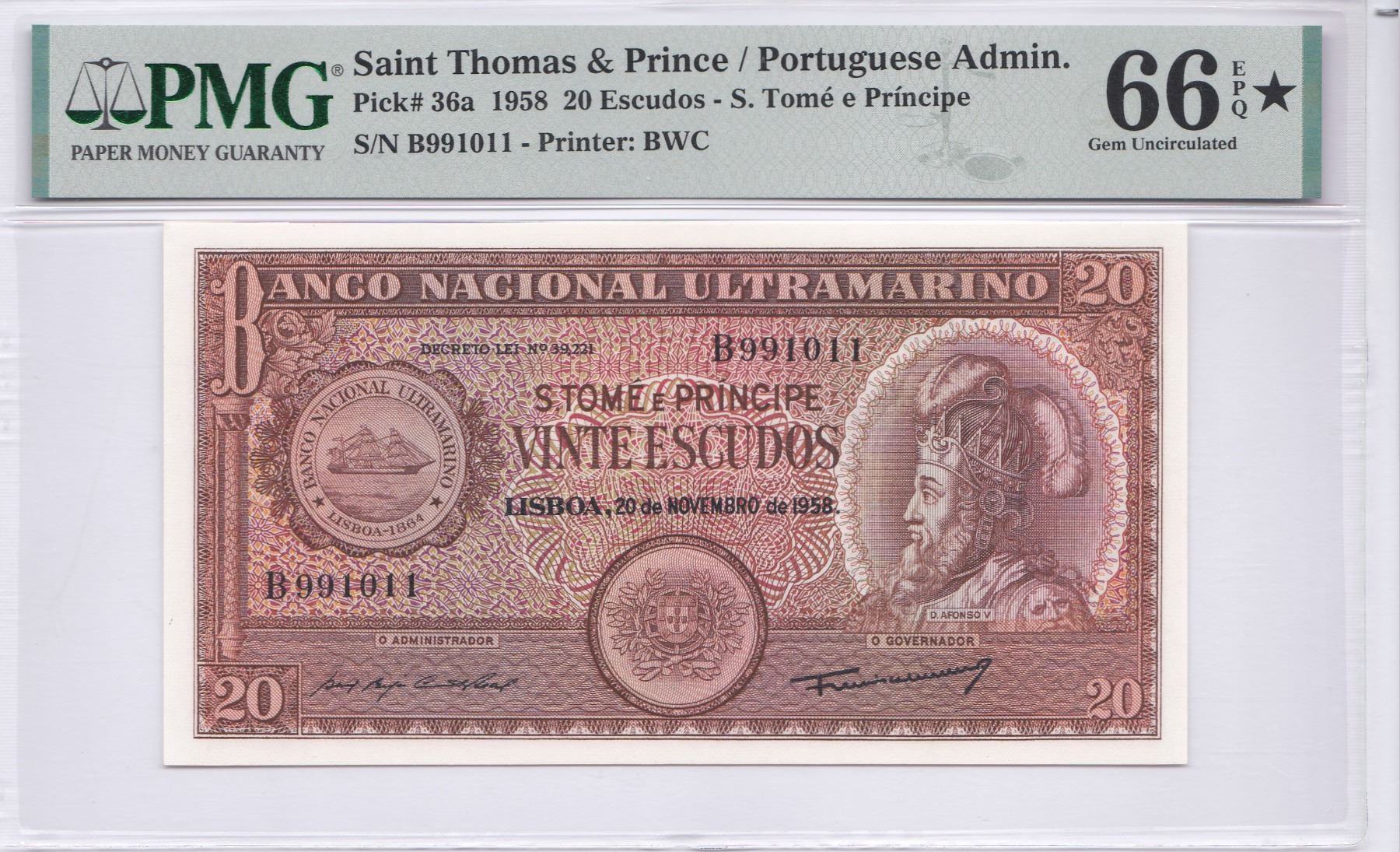 1958, 葡屬聖多美和普林西比, 20 Escudos, 編號: B991011, PMG 66EPQ 星標