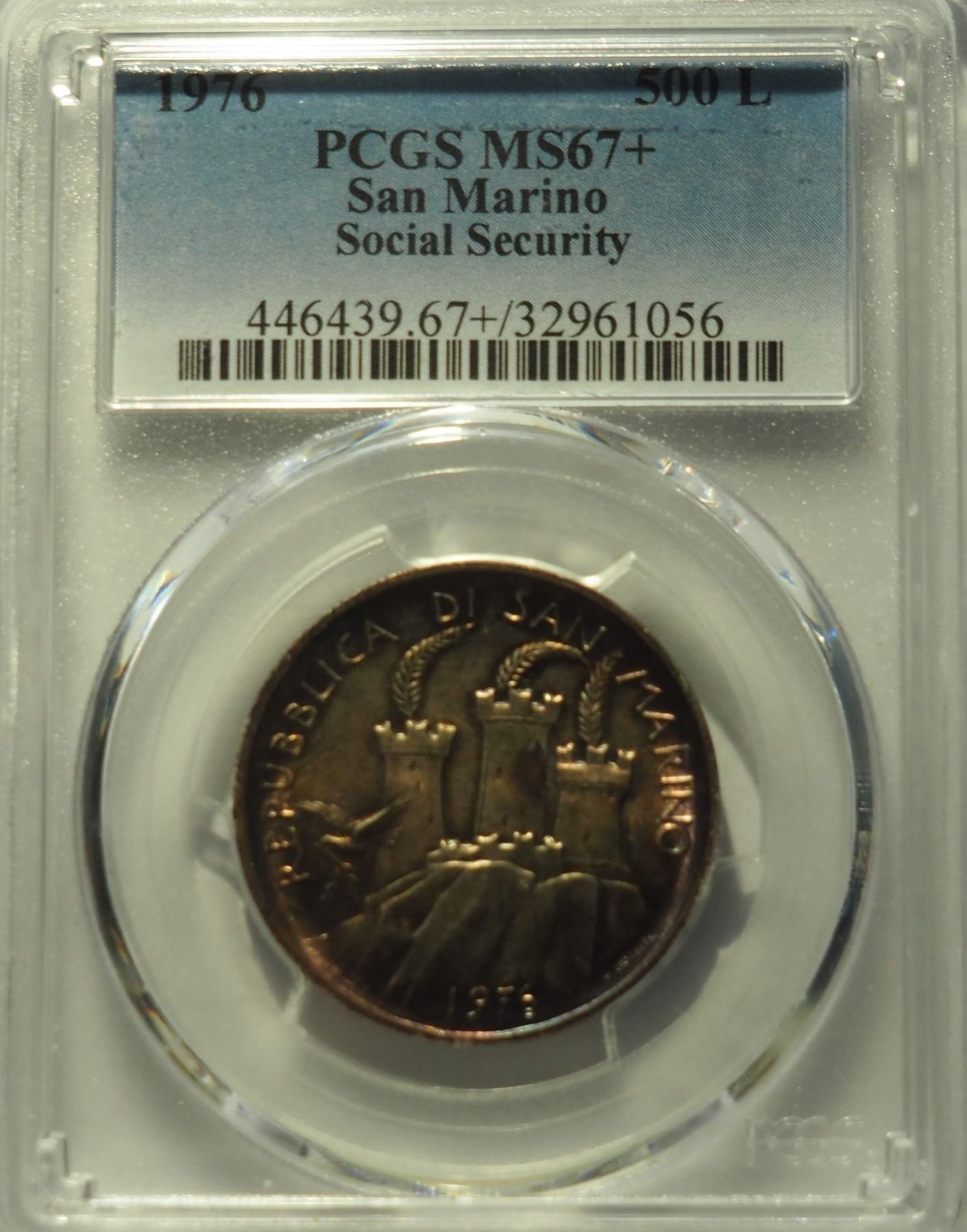 San Marino, 500 Lire silver coin, 1976, PCGS MS67+ Social Security