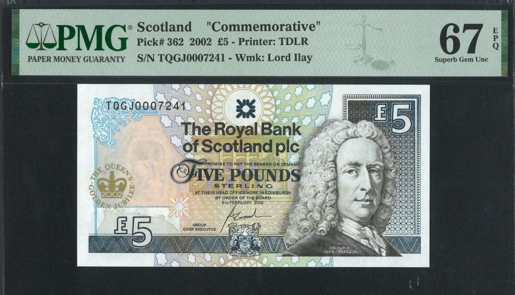 2004, 蘇格蘭, 5 鎊, 編號: TQGJ0007241. PMG 67EPQ. QEII 登基金禧紀念鈔