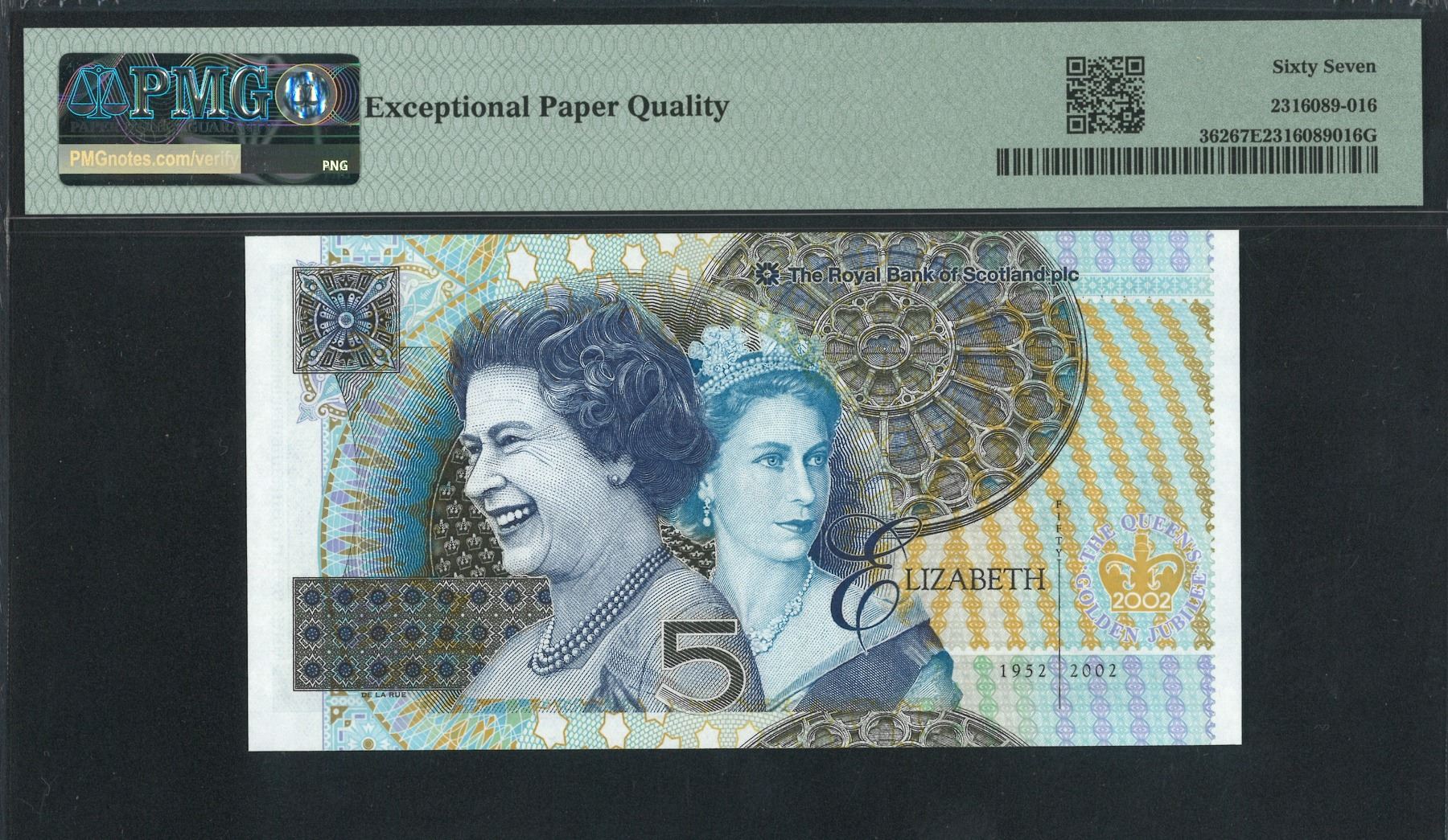 Scotland, 2002, 5 Pounds, TQGJ0007241. PMG 67EPQ. QEII Golden Jubilee Commemorative.